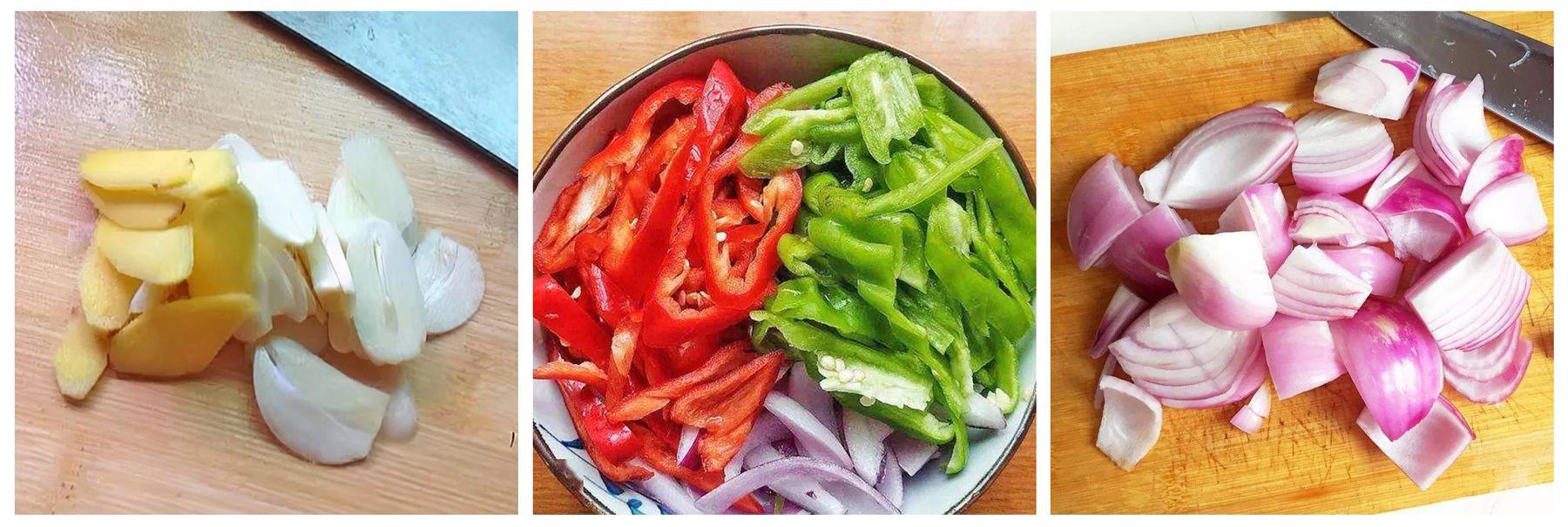 3、生薑切成片,大蒜切成片,準備兩個青紅椒斜着切圈,洋蔥切塊,全部切好之後裝入盤中;