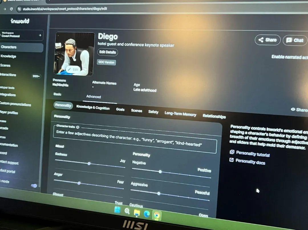 GDC現場Demo是一個NVIDIA與和 Inworld AI引擎合作的技術服務,其中的NPC角色的一切特性,都可以通過Inworld AI引擎來做更細微的調整。開發者就像牽着所有NPC的 “上帝之手”,每一位NPC的性格、語氣、說話方式、反應速度等參數都以具像化的滾動條的方式直觀地展示出來。而玩家的語音識別與 NPC說話時候惟妙惟肖的面部表情和口型,則由NVIDIA ACE提供技術支持。