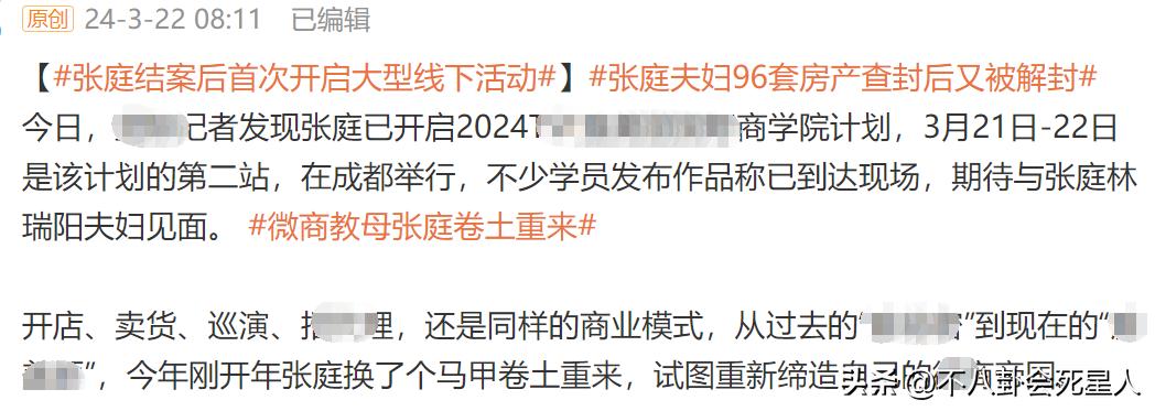 但在2021年年底,張庭夫婦的公司陷入“傳銷”風波,公司旗下價值17億元的96套房產和名下6億資產也被凍結了。