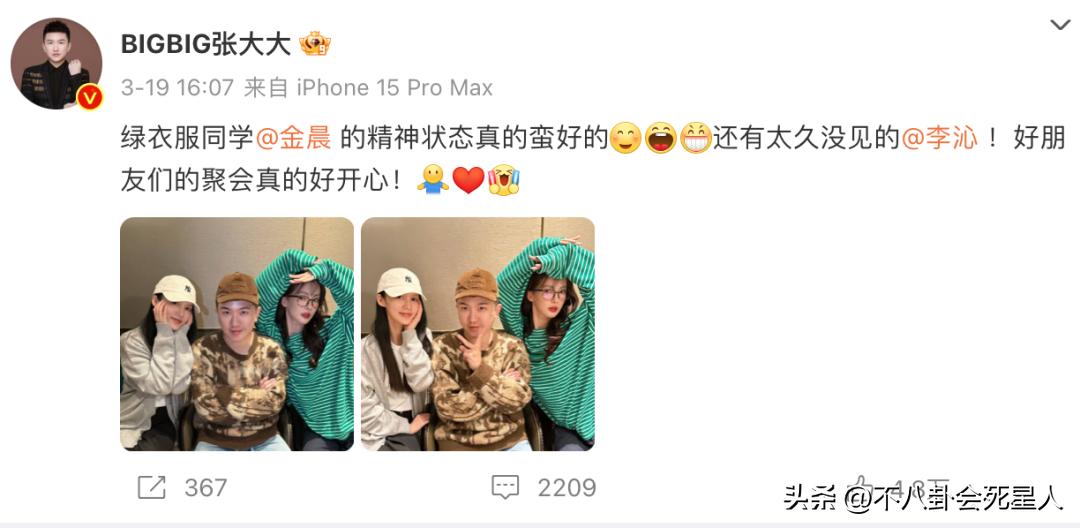 起因是張大大曬出了自己和金晨、李沁的合照,張大大居C位,李沁、金晨分別在兩側。這個pose看着頗爲眼熟,原來當年張大大和楊穎、楊冪拍照時,也是類似的姿勢。