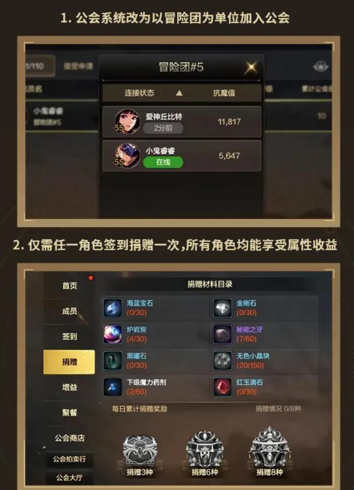 在《DNF》中,一個賬號下的多個角色會以“冒險團”的形式享受屬性加成,而無論是好友還是公會這樣的社交系統,在手遊中都變更成直接以冒險團爲單位互動。一個角色加入公會,便可自動讓所有其他角色一併加入;任意角色簽到一次,也可讓其他角色享受到屬性收益。