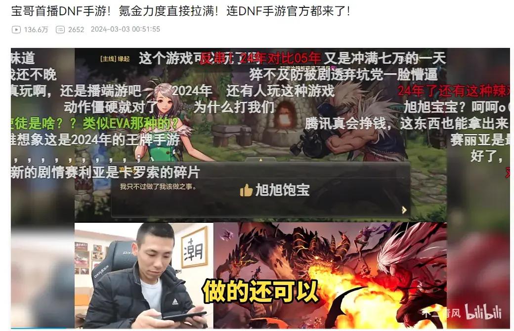 作爲該遊戲的當家主播,旭旭寶寶從3月3日開始直播《DNF》手遊多日,首播當天不僅熱度瞬間達到了10W+,該時段的觀看人數也一度突破了30萬。