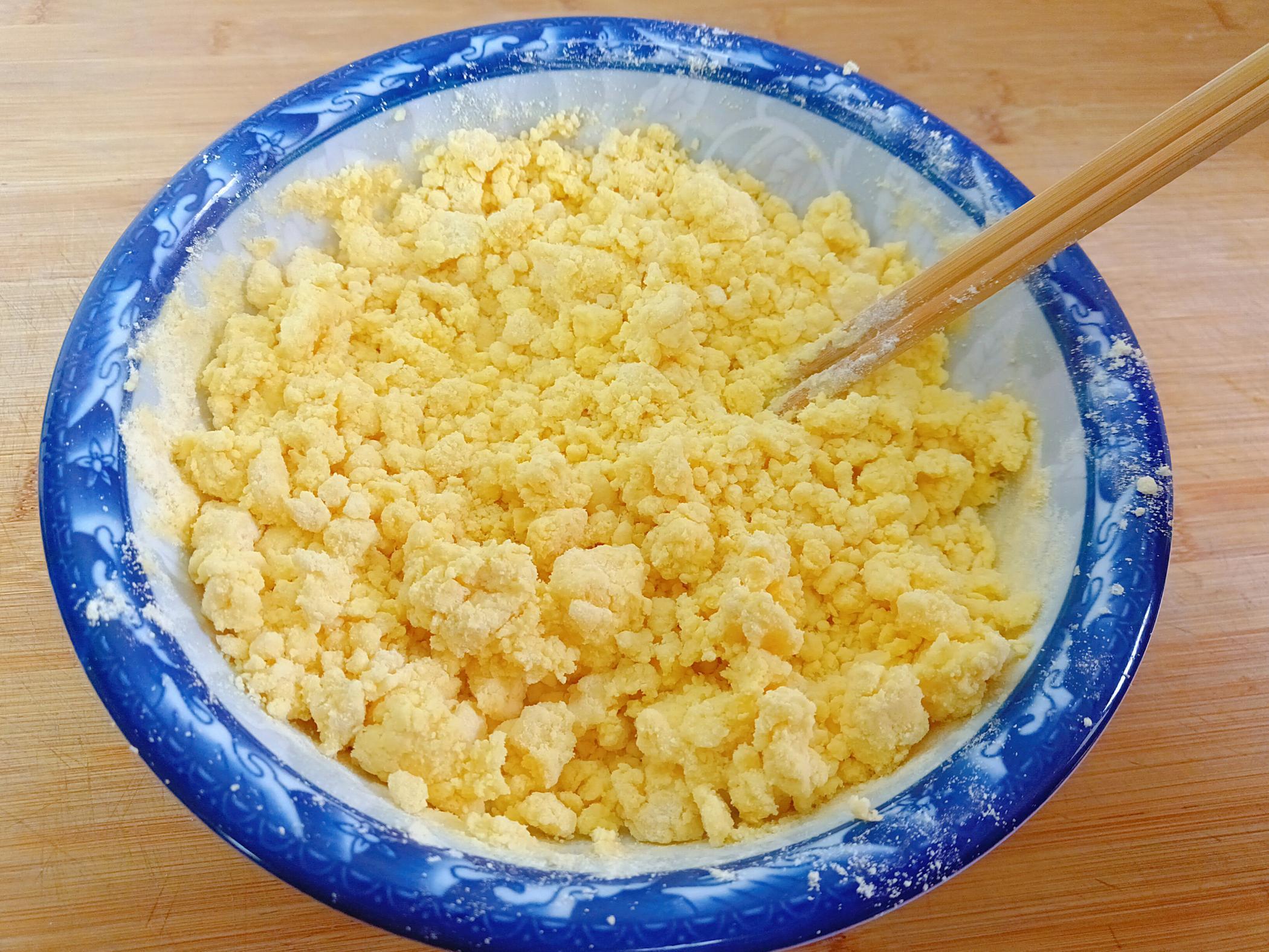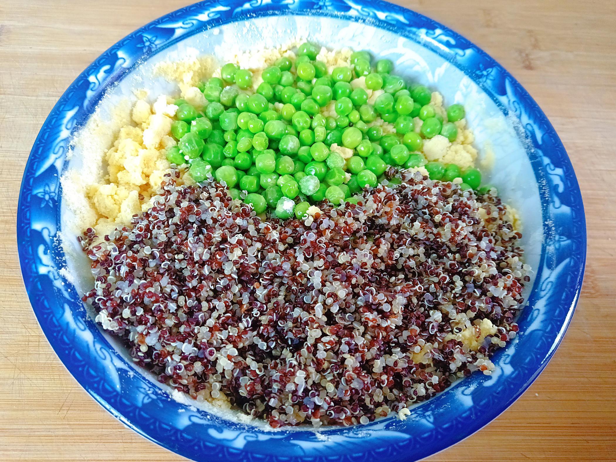 4、燙好的玉米麪裏面加入青豆、藜麥,再次充分攪拌均勻。