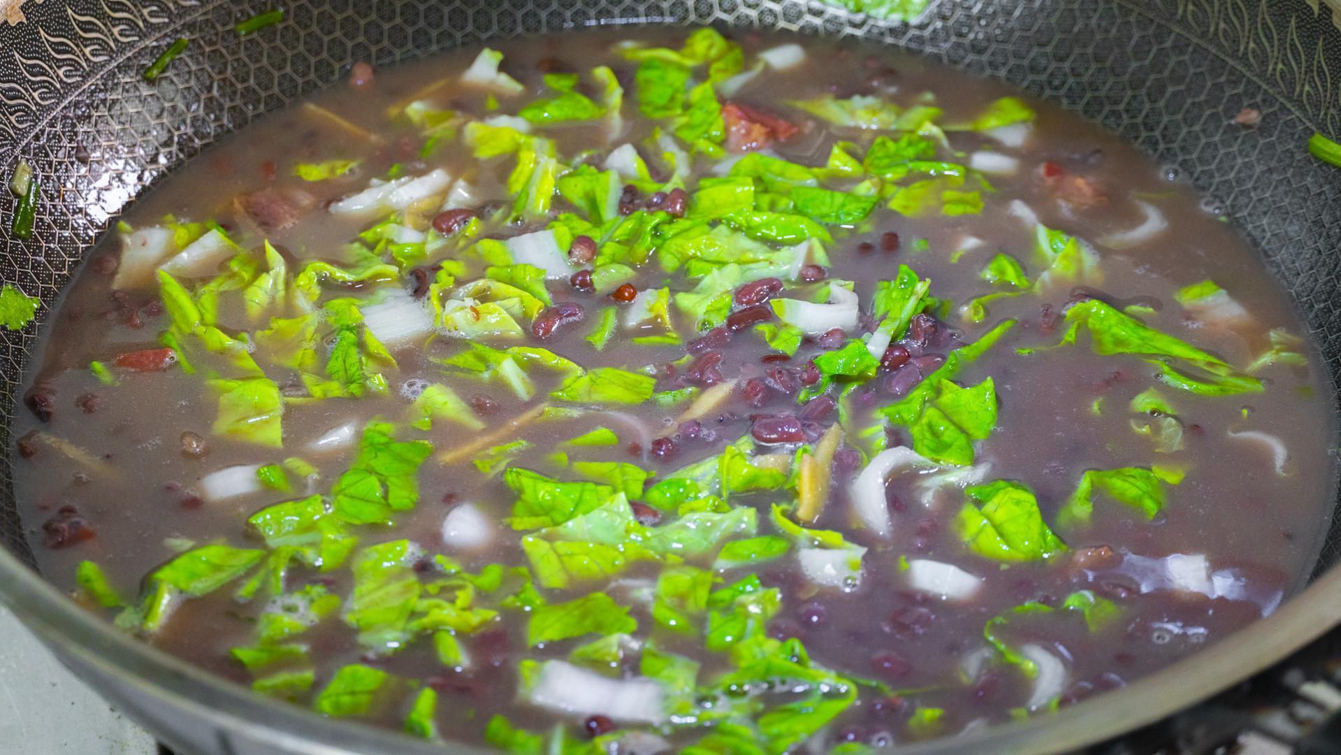 4、起鍋熱油,下火腿炒香,接着把蔥薑蒜也加進來大火爆香,倒入煮好的紅豆,湯也一起倒進來,調味加一勺鹽,一點點的雞精,一勺生抽,接着大火煮開,最後加入青菜,拌勻後就可以關火了,出鍋前撒點小蔥花,好喫又好喝的紅豆青菜湯就做好了。