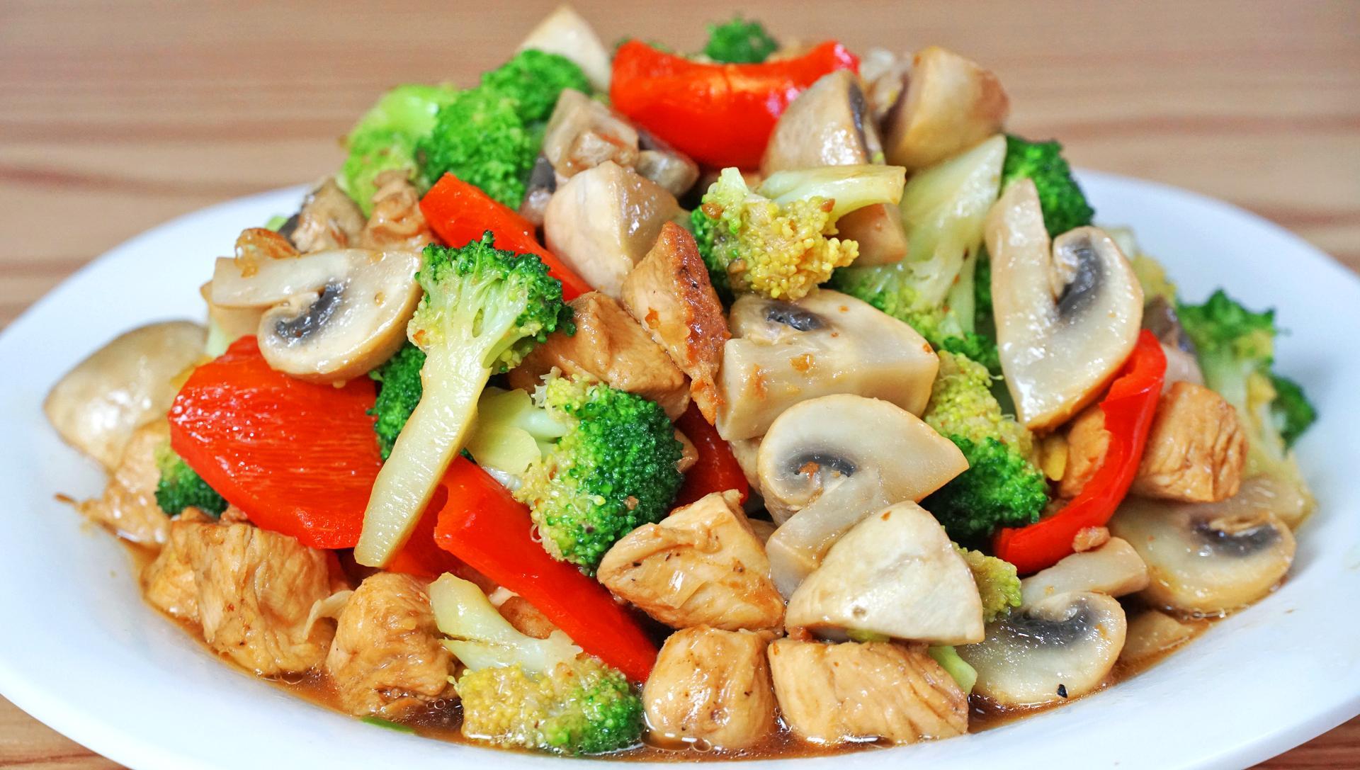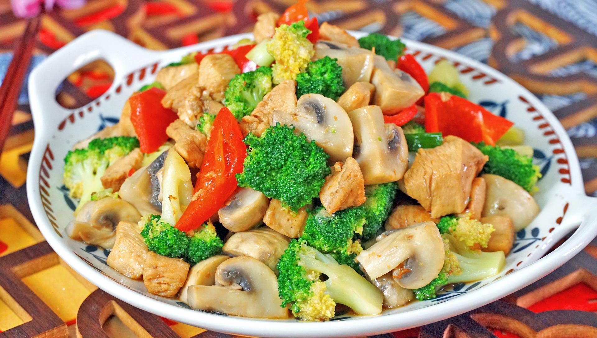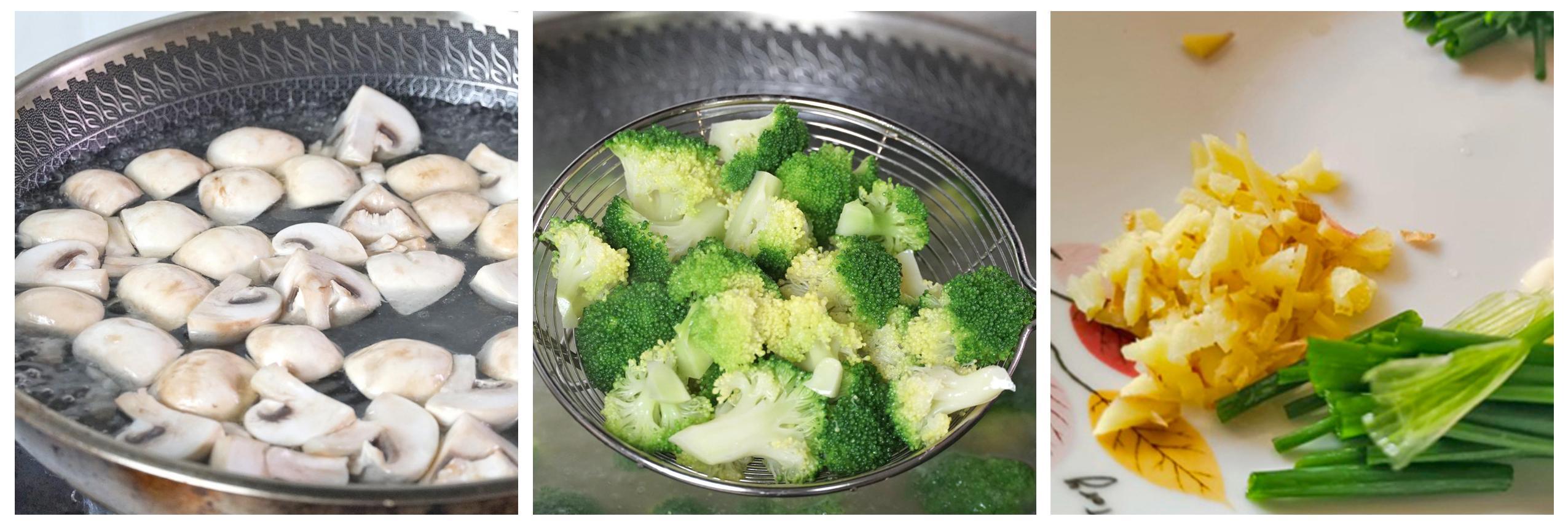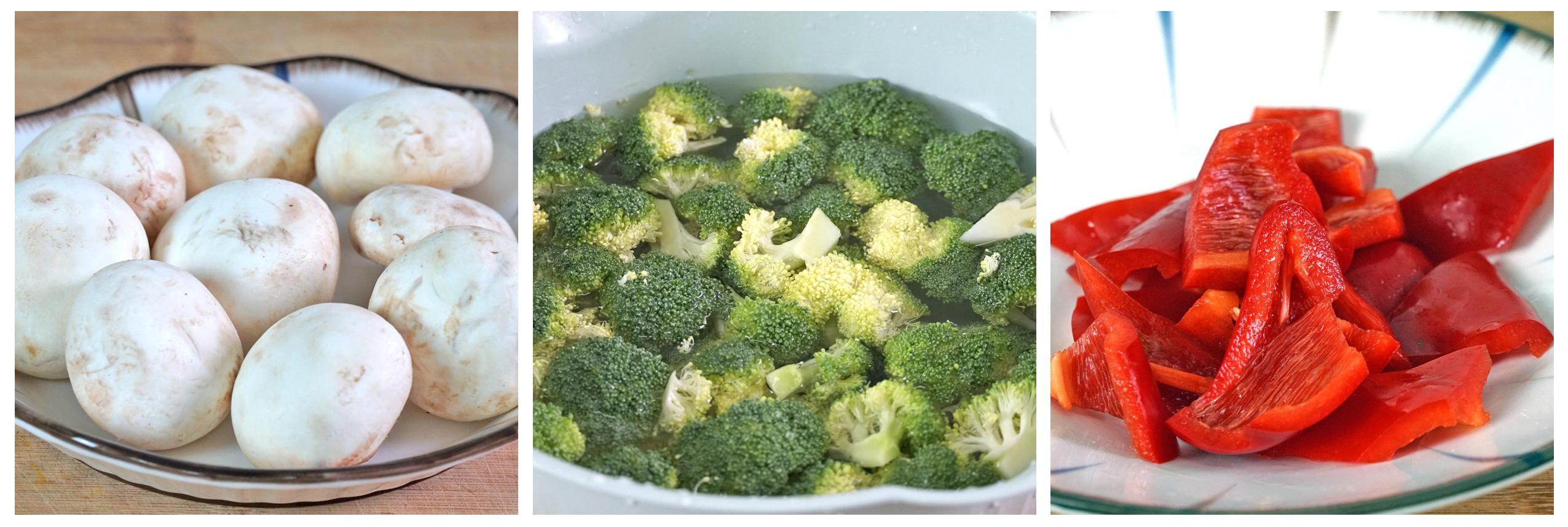 食材:口蘑、西蘭花、胡蘿蔔、雞胸肉、紅菜椒、生薑、大蒜