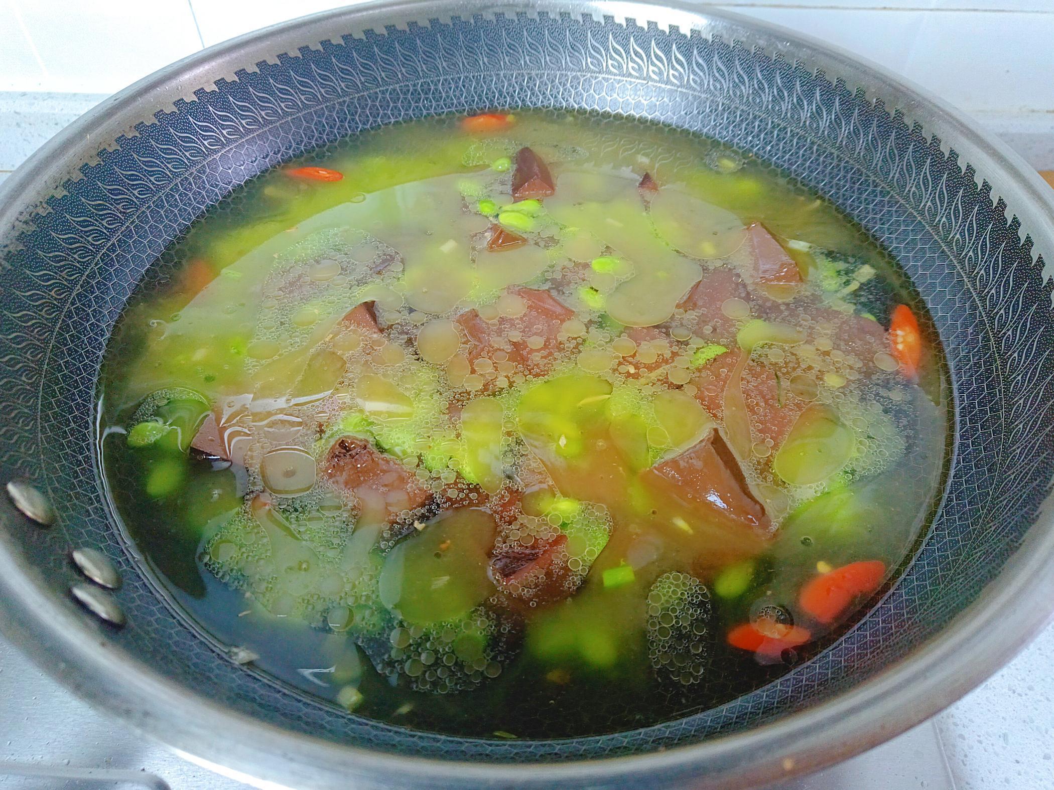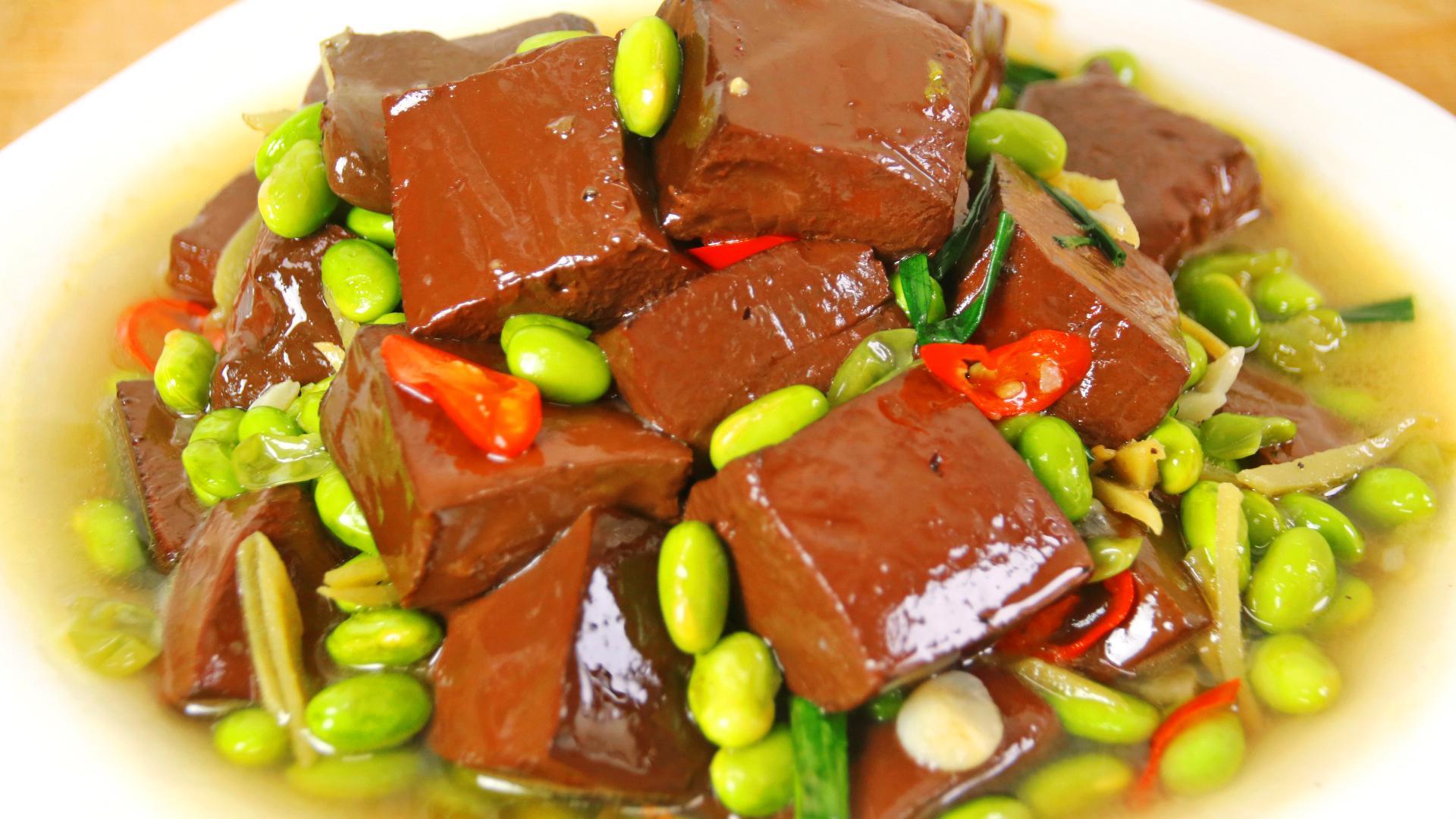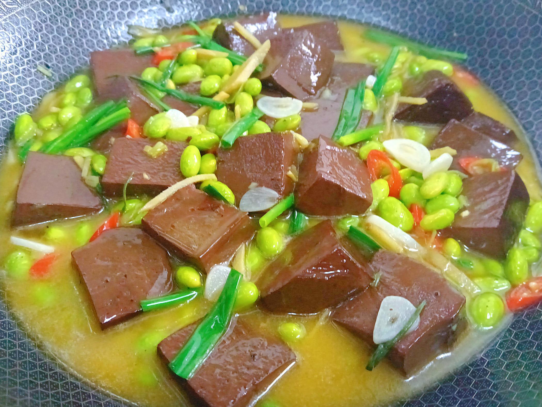 4、起鍋熱油,下薑絲、蔥段、小米辣大火爆香,接着把豬血和毛豆倒進來,再加一碗清水。調味加鹽、雞精、胡椒粉。中火煮開後先用勺子撇一下浮沫,接着繼續煮6分鐘。