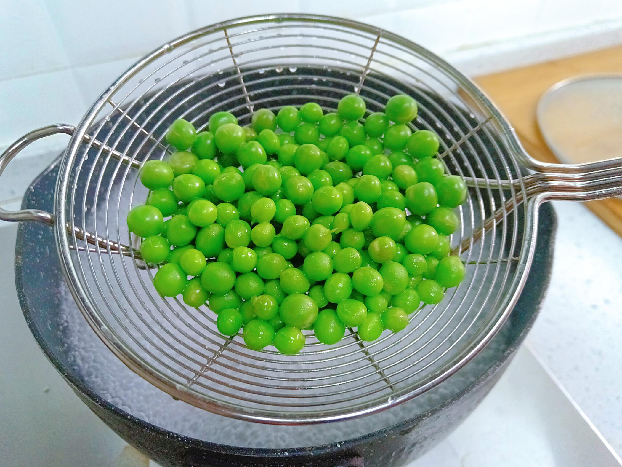 1、新鮮豌豆100克,剝殼後清洗乾淨,起鍋燒水,水開加一勺食用油,接着把青豆倒進來焯水,大火煮到豆子飄起來就熟了,撈出來瀝乾水分放涼就可以了