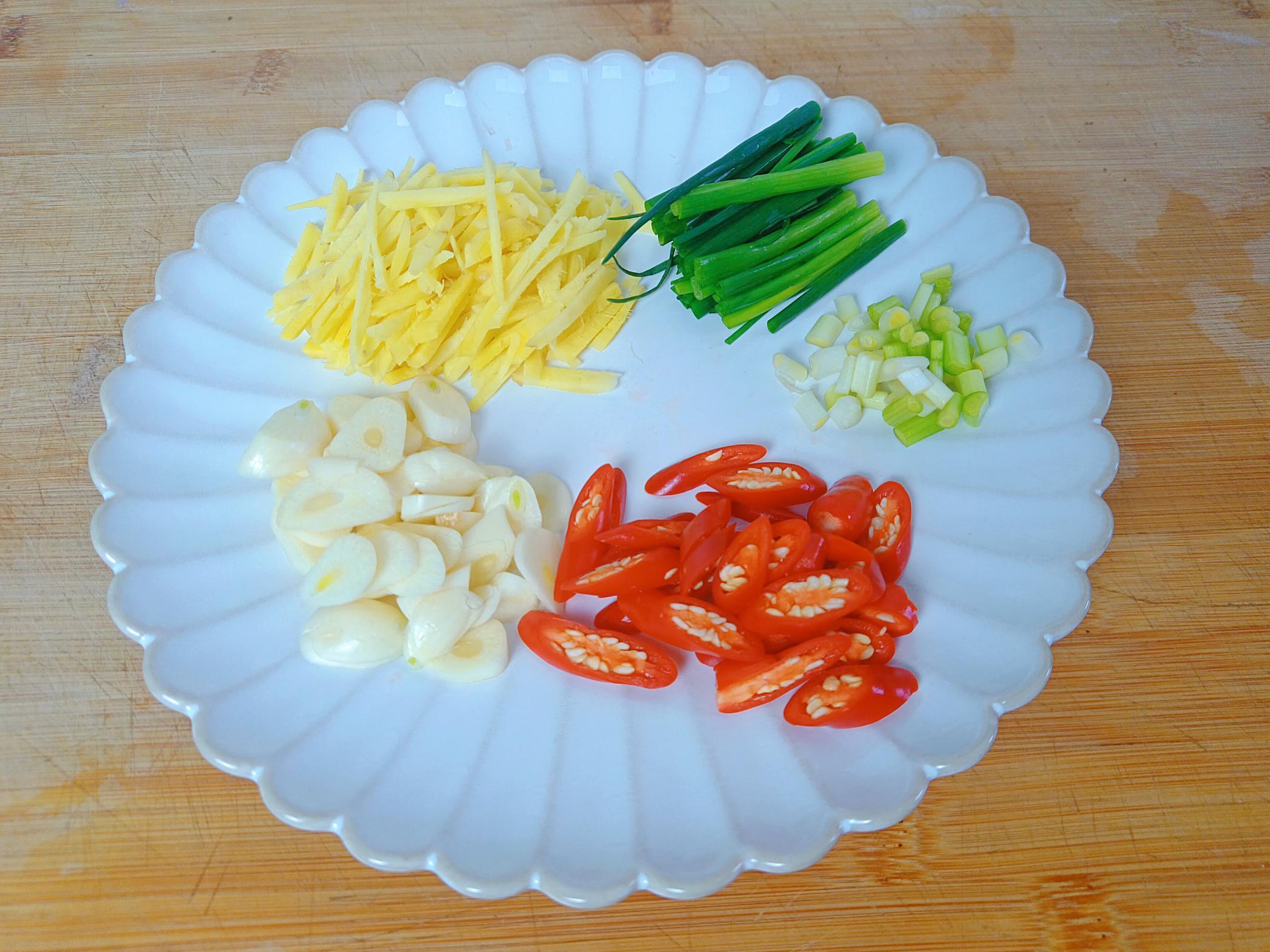 3、生薑一塊,洗淨後切薑絲;小蔥2根,切蔥段兒;小米椒2個,切成小圈圈備用。