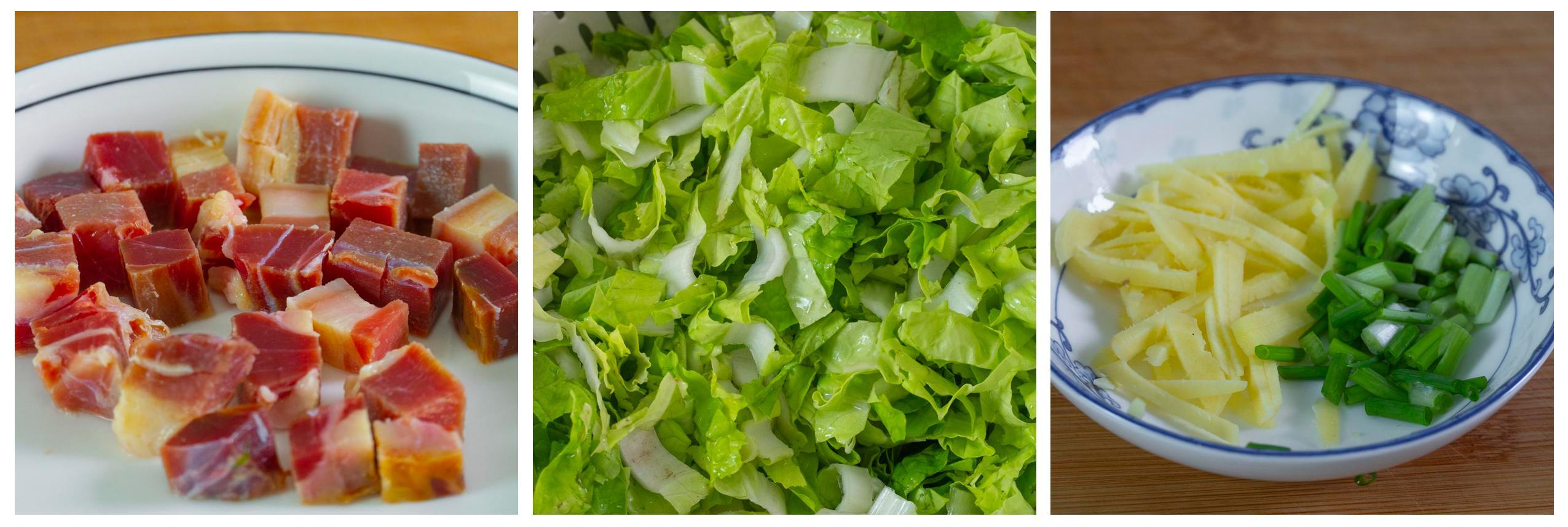 2、火腿一小塊,清洗乾淨切小丁,小白菜兩顆,清洗乾淨後切絲,準備點蔥薑蒜,小蔥切蔥花,大蒜切片,生薑切絲。