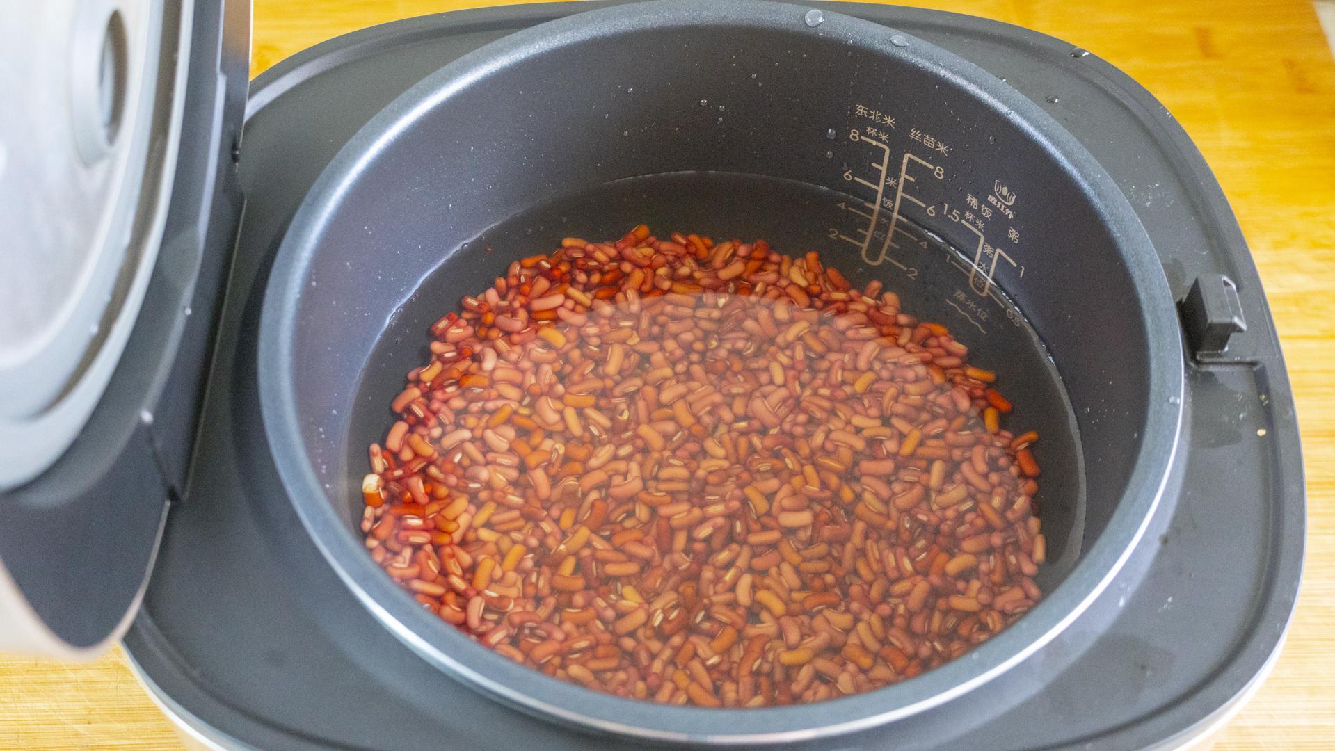 1、紅豆300克,清洗乾淨後加水提前泡發一晚。第二天倒入電飯煲中,再加一大碗清水,水量沒過紅豆,把紅豆煮熟煮軟。