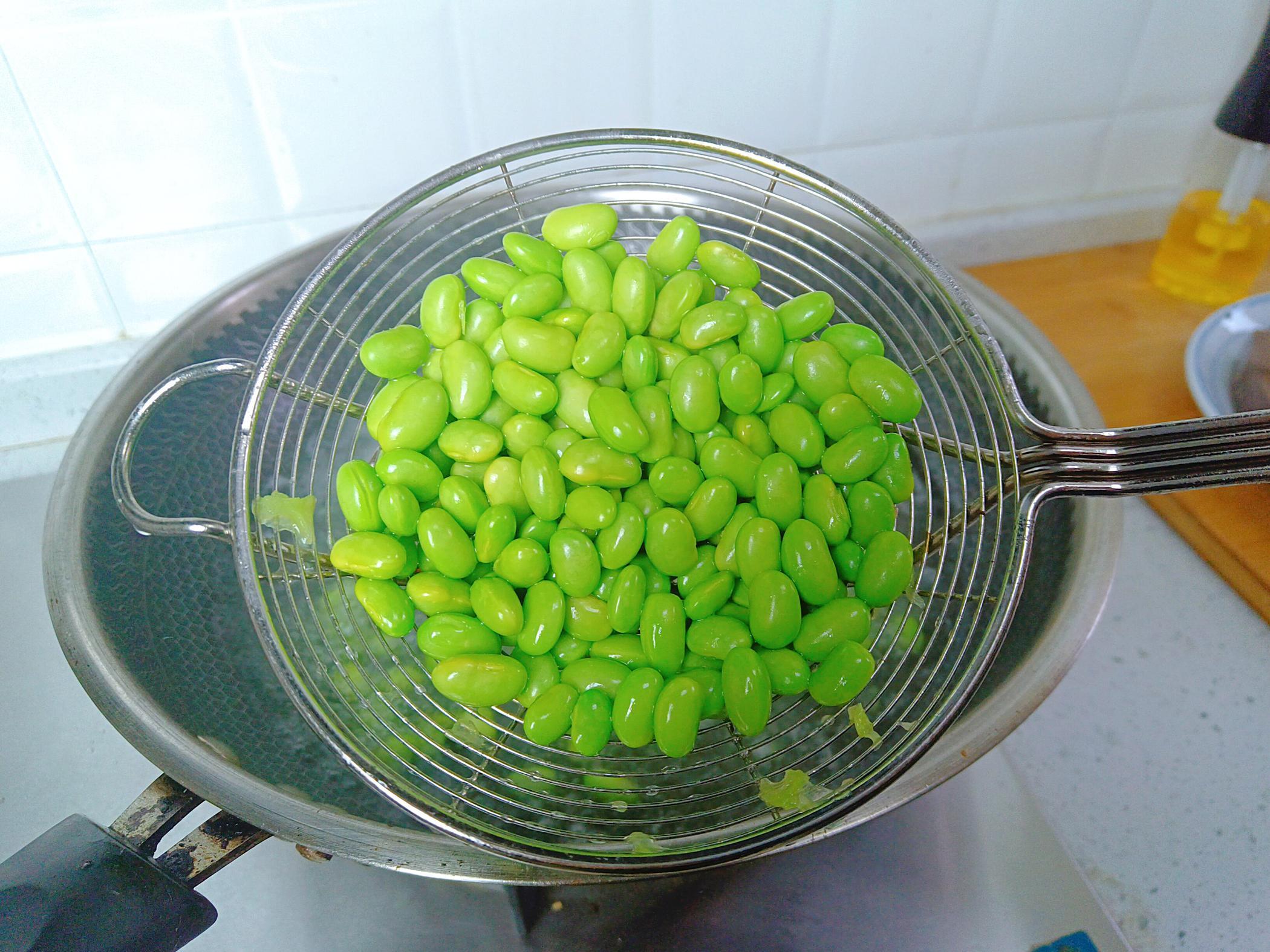 2、新鮮毛豆200克,起鍋燒水,加一勺鹽和一勺食用油,然後把毛豆倒進來焯水。煮熟後撈起來瀝乾水分備用。