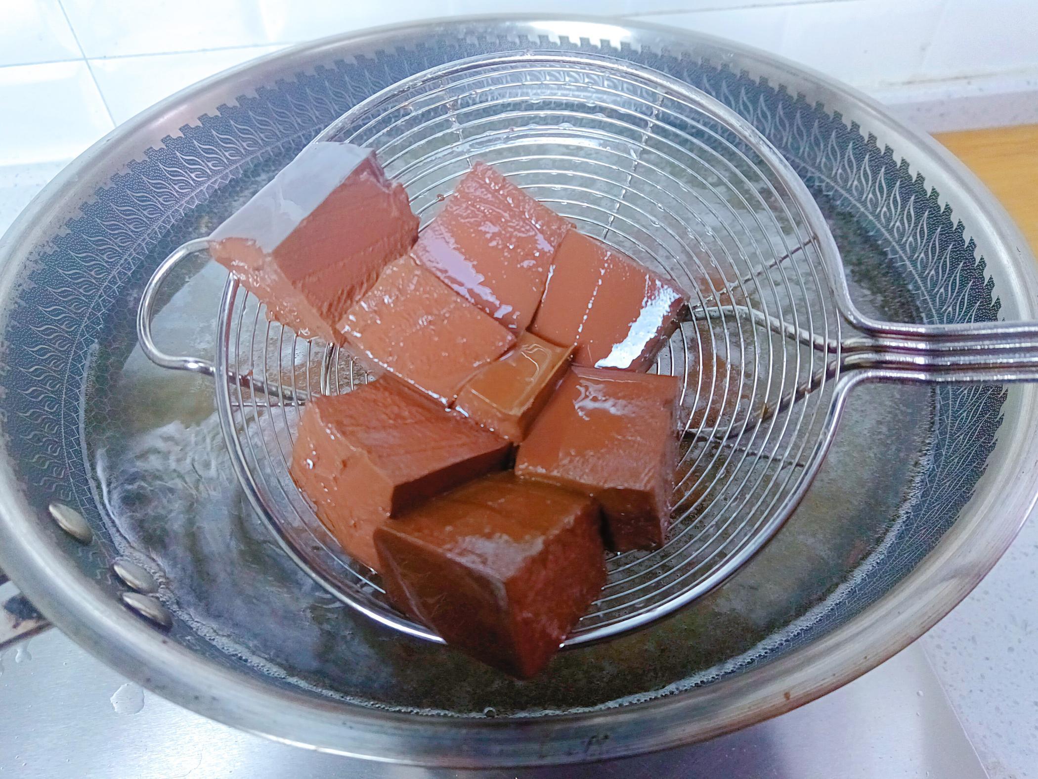 1、新鮮的豬血2塊,清洗一下後切成小塊兒,起鍋燒水,水開倒入豬血,再加一勺料酒去腥。大火煮1分鐘後就可以關火了,撈出來後瀝乾水分備用。