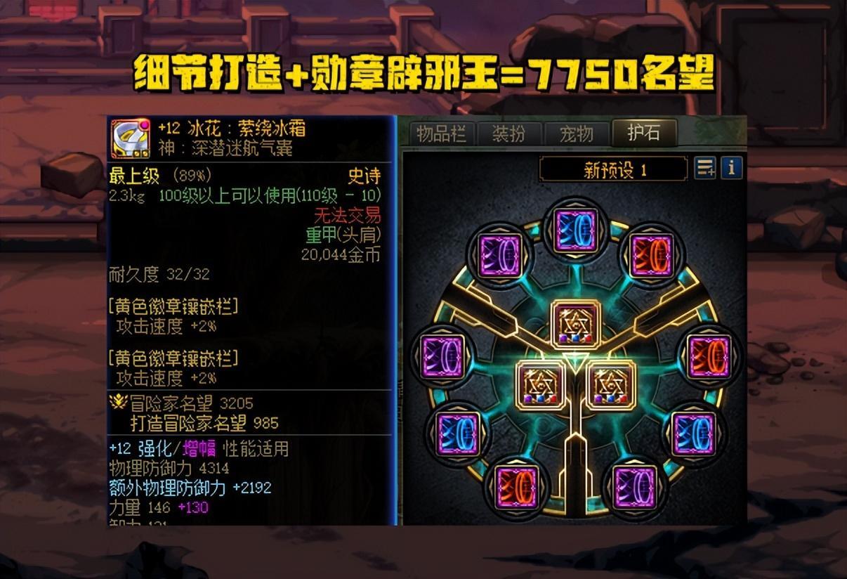 【2,打造名望】這個板塊包含內容就比較多了、全身的附魔、徽章、符文、護石、勳章、天賦、辟邪玉等,總計可帶來7750名望值!