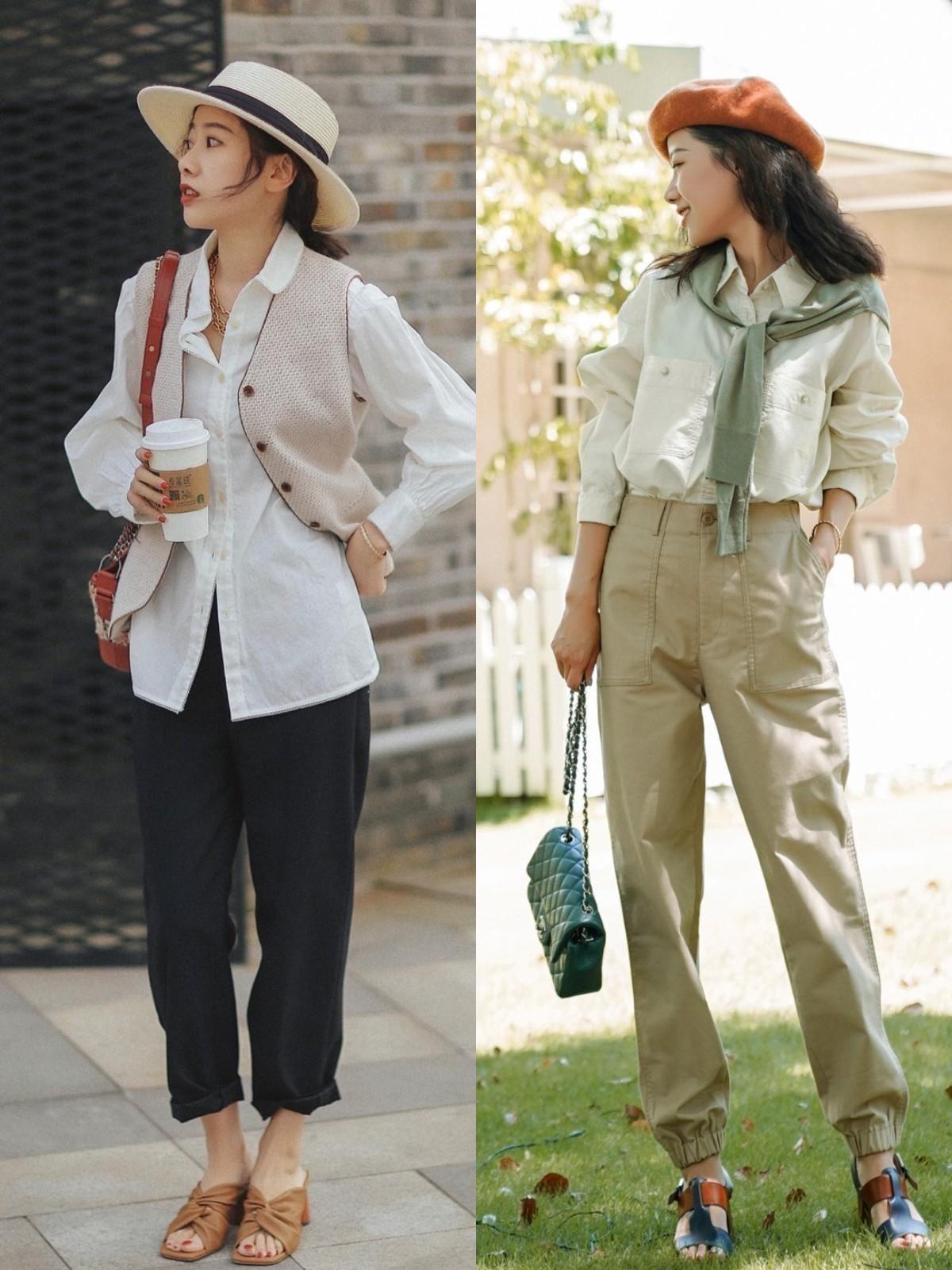 如果想要讓你的春季造型看上去更輕盈,那麼就可以將整體的重心轉移到上半身。選擇一件基礎款式的襯衫疊穿馬甲或者披肩,在佩戴上一款符合整體風格的帽子即可。