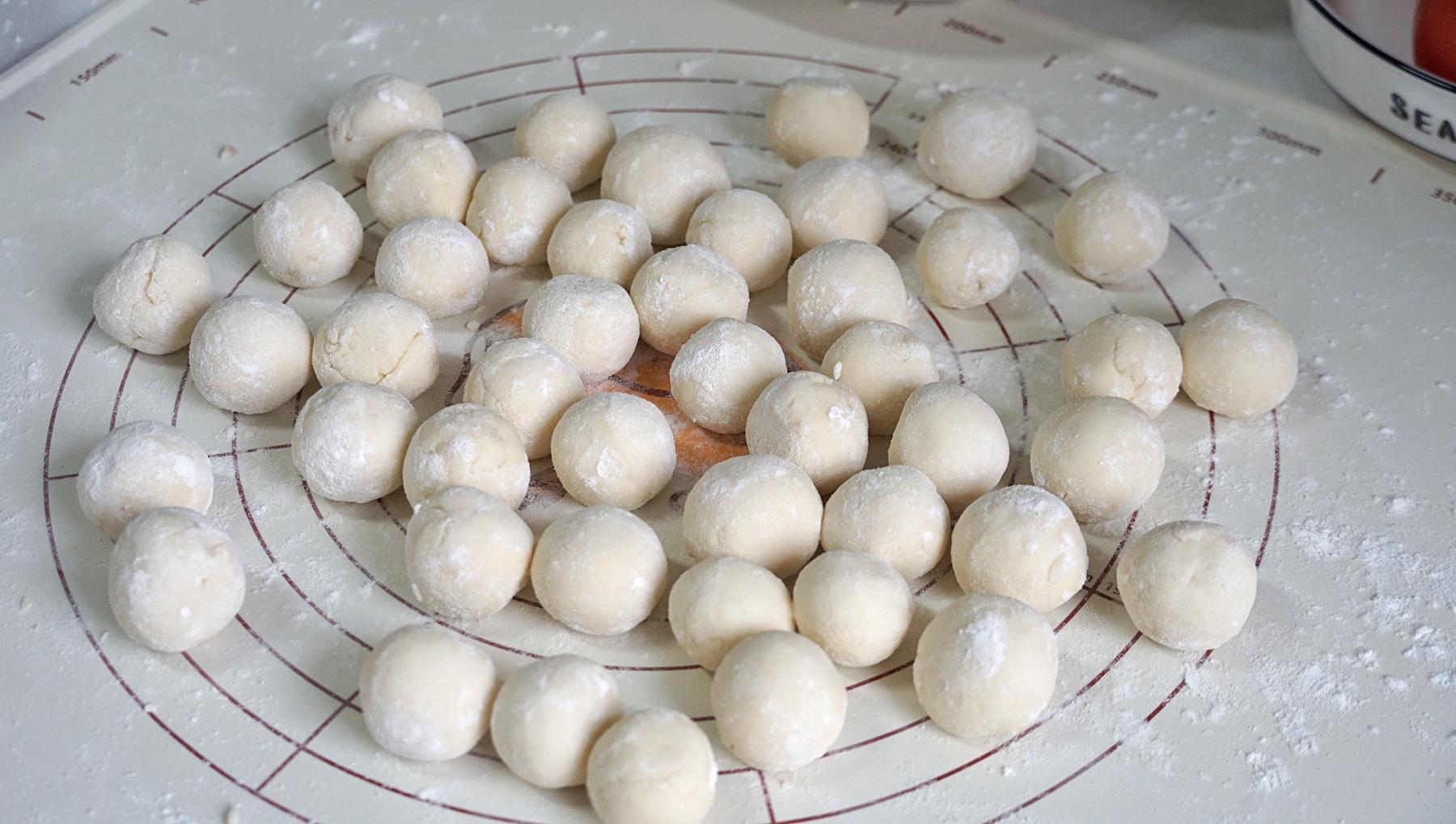 6、然後再一勺麪粉,攪拌攪拌,再和它揉一下,幹了就加點水,粘手就加點麪粉,能揉成團就行;取出來搓長條,分小劑子,再撒點乾粉防粘後搓成小圓球,大小隨意;這個做法蠻簡單的,一次不用做太多,喫多久就做多少;