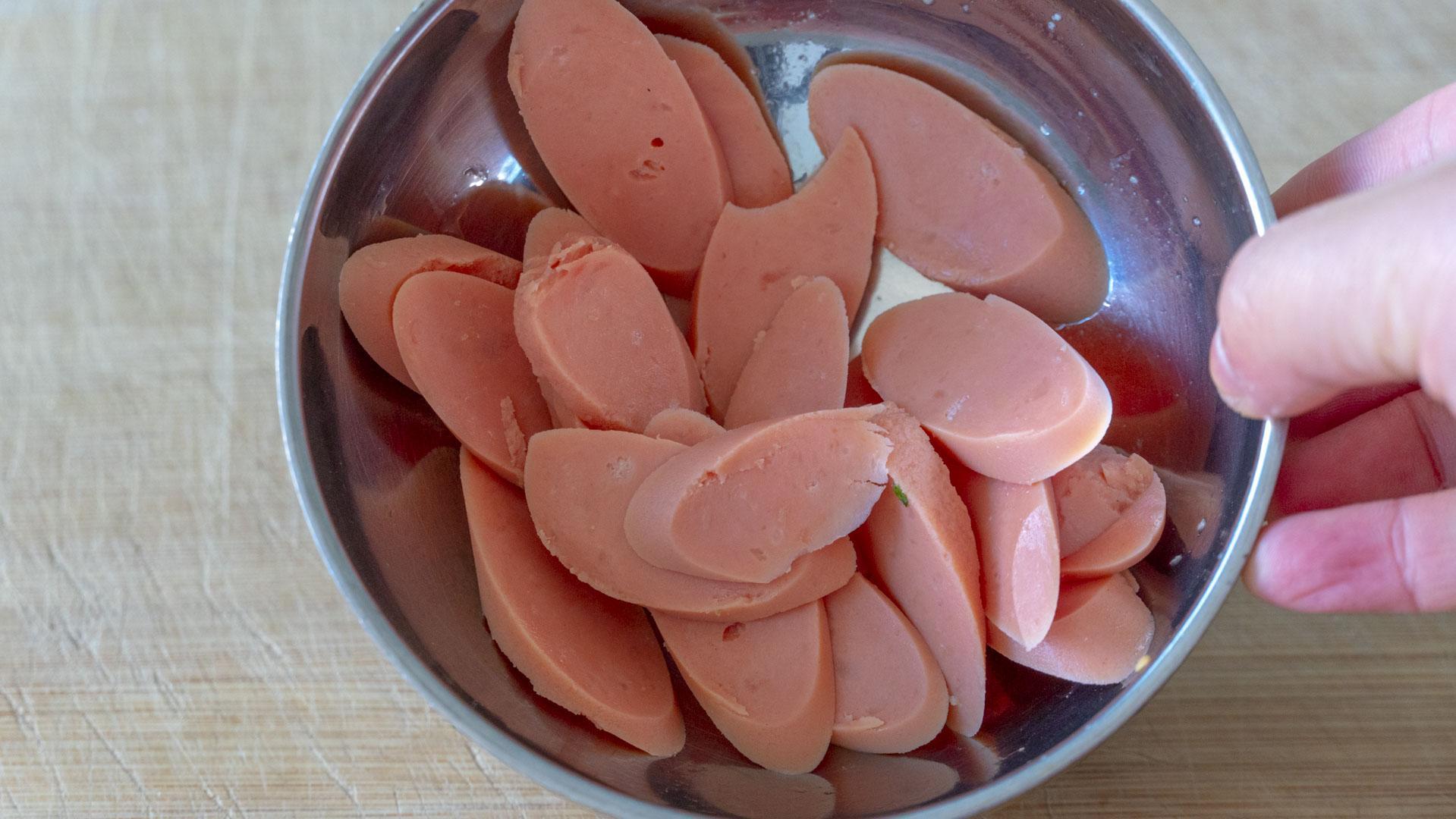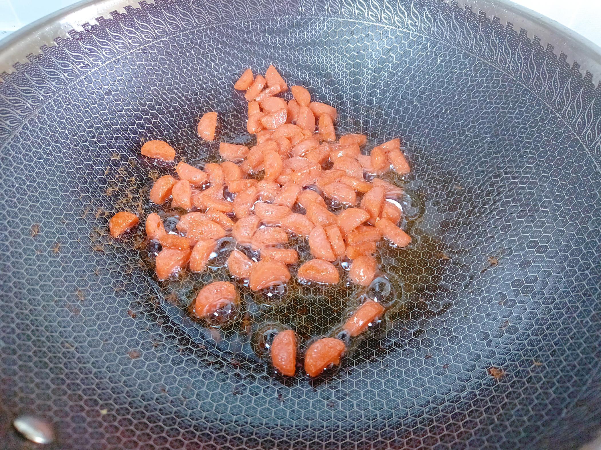 5、火腿腸2根,再切成小丁。起鍋熱油,倒入火腿腸,先把火腿腸炒一下,炒到有點焦焦的就可以了。