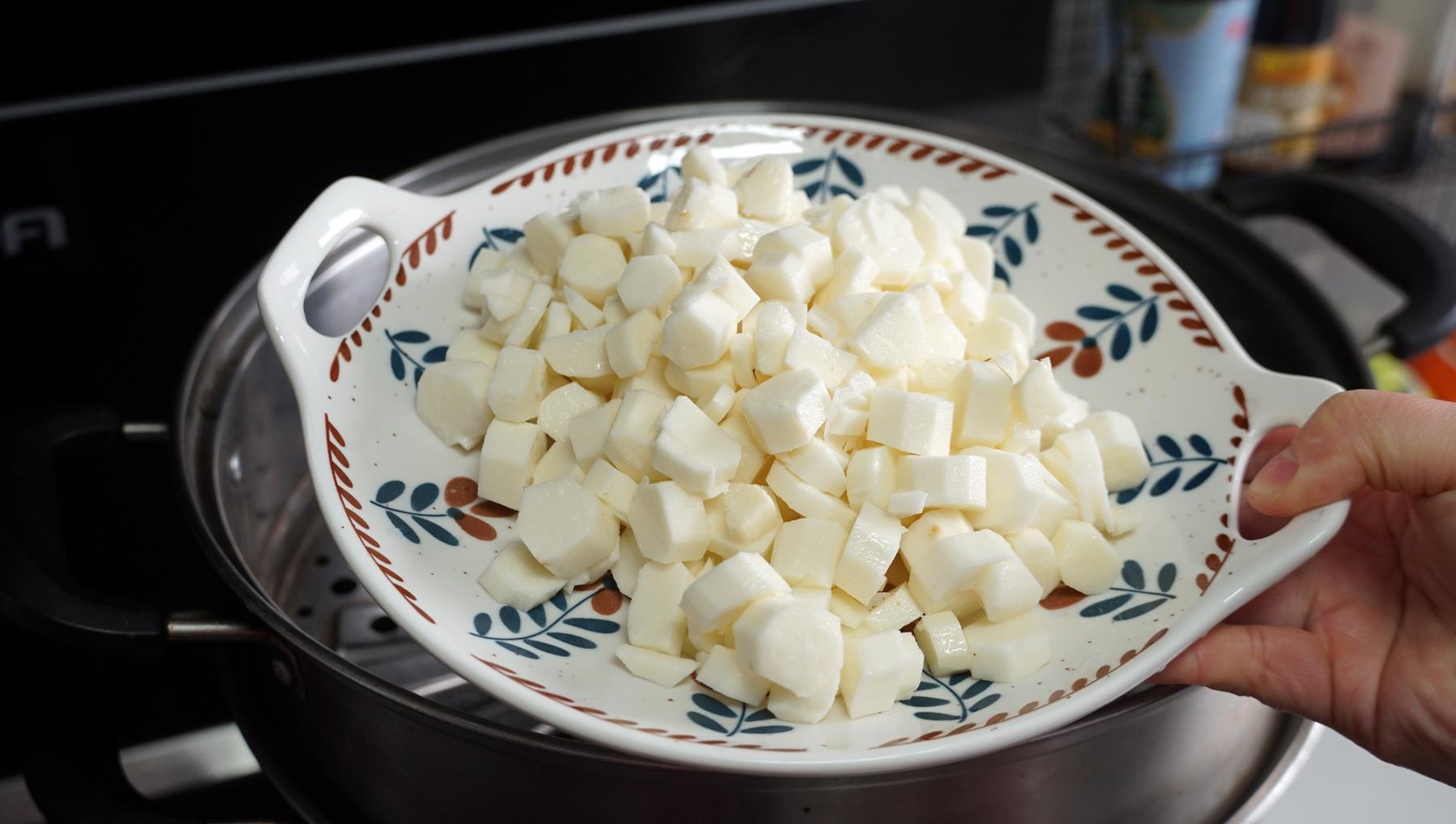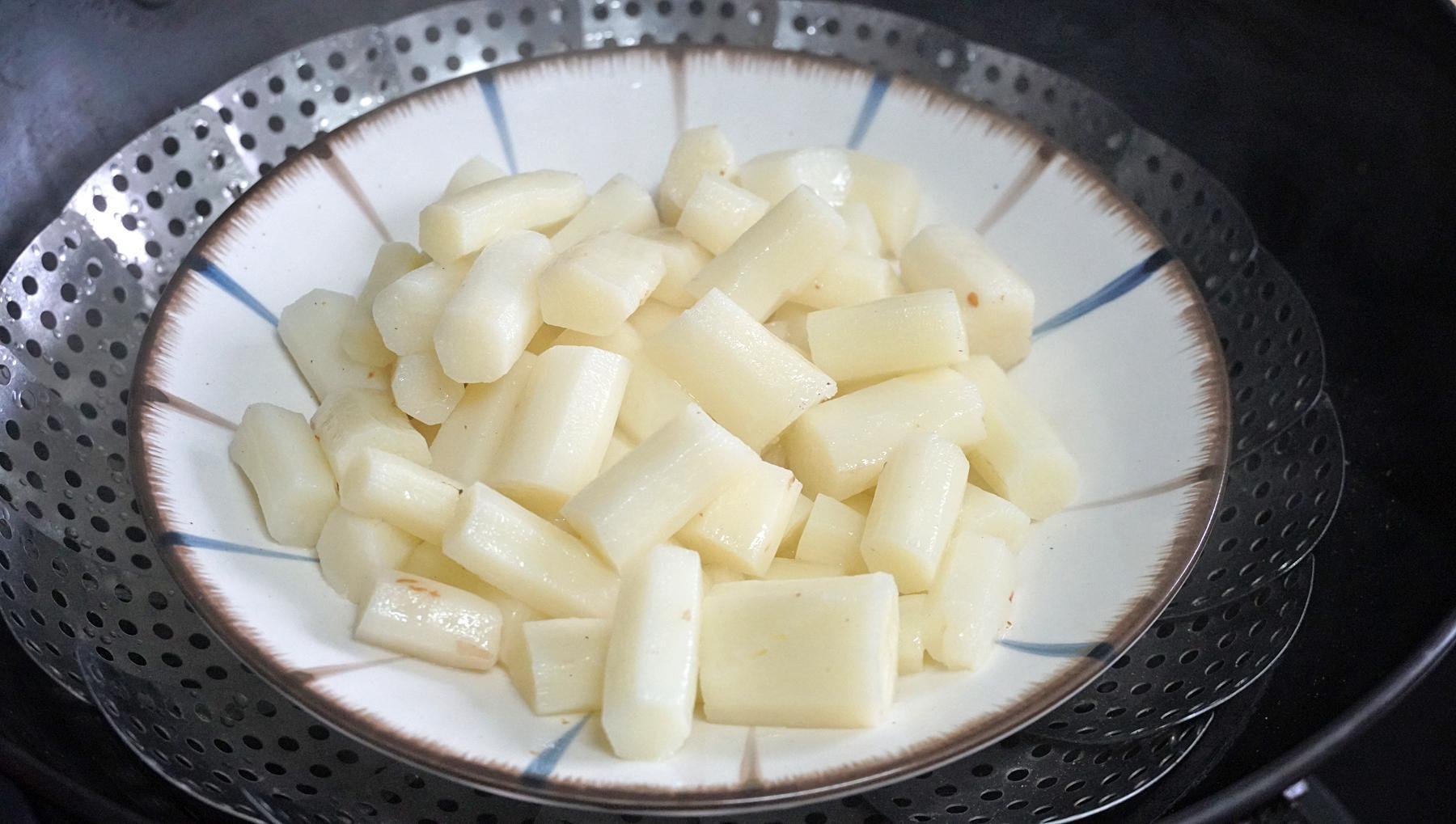 1、鐵棍山藥去皮了切小塊,先給它蒸熟;