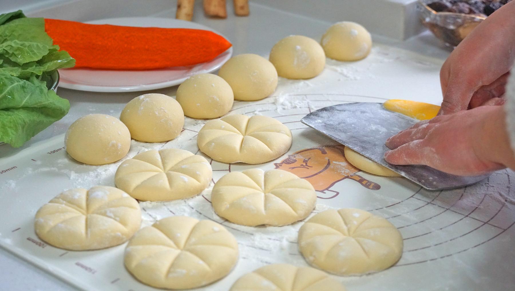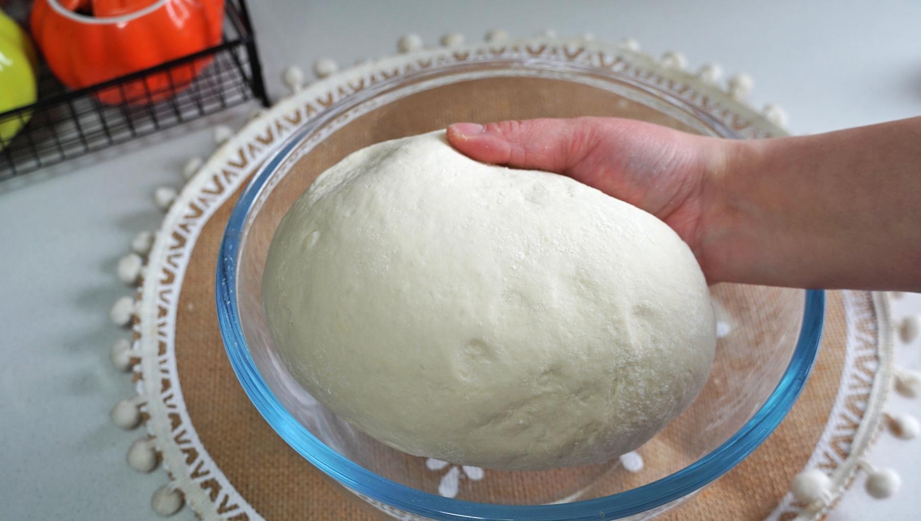 3、明天早上就能多睡20分鐘,早上起來還是先揉麪,發的還不錯啊,變大了些,直接放揉麪墊上來揉,這次可以給它揉一會兒;