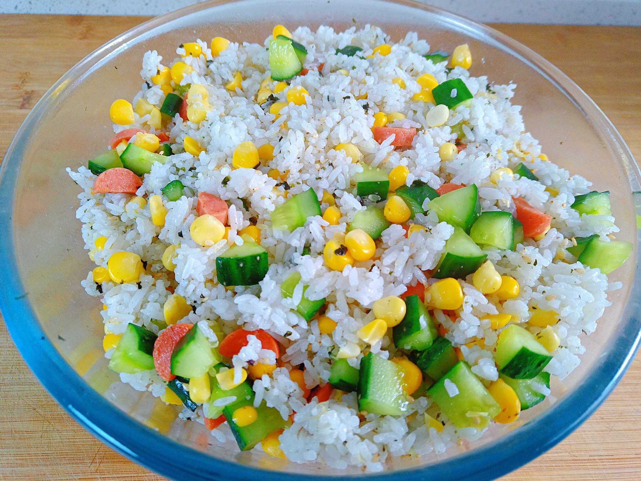 7、準備一個大碗,把煮熟的米飯倒進來,再把配好的蔬菜也倒進來。