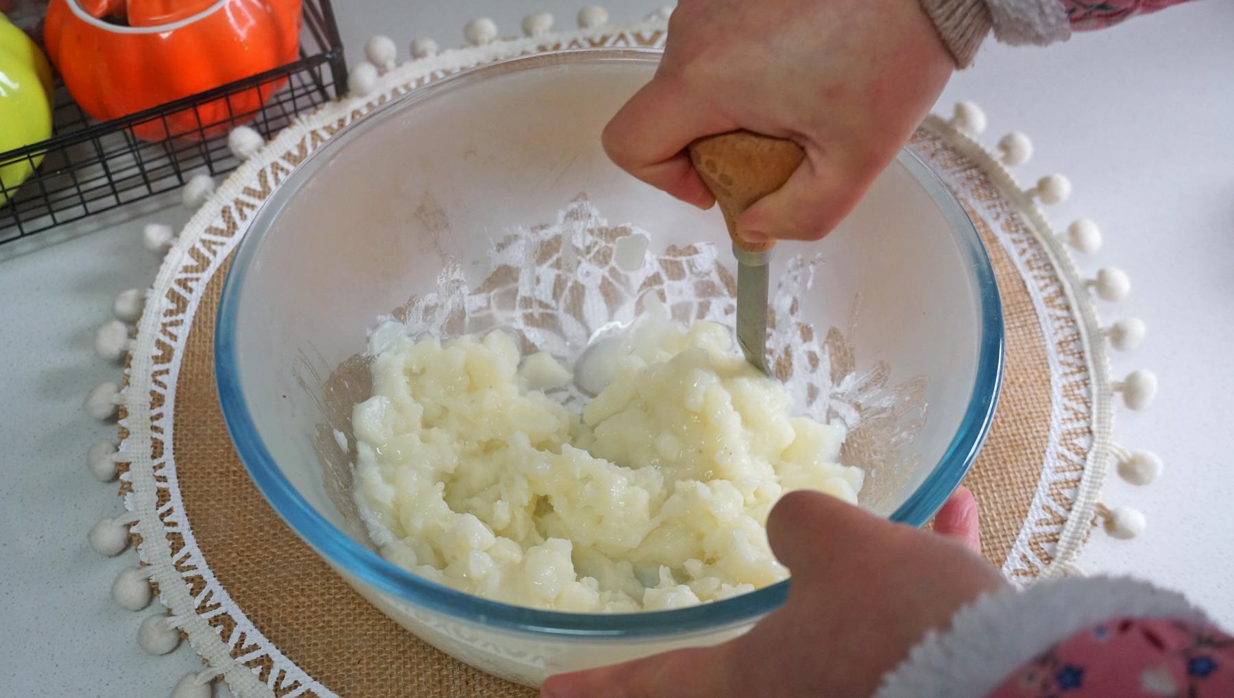 5、山藥熟了就取出來,加一點點鹽壓成泥,
