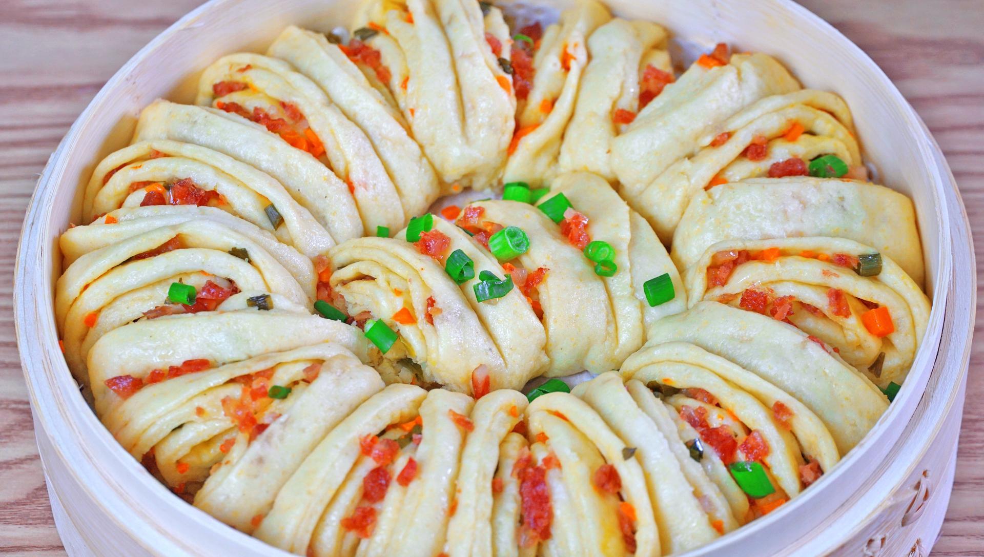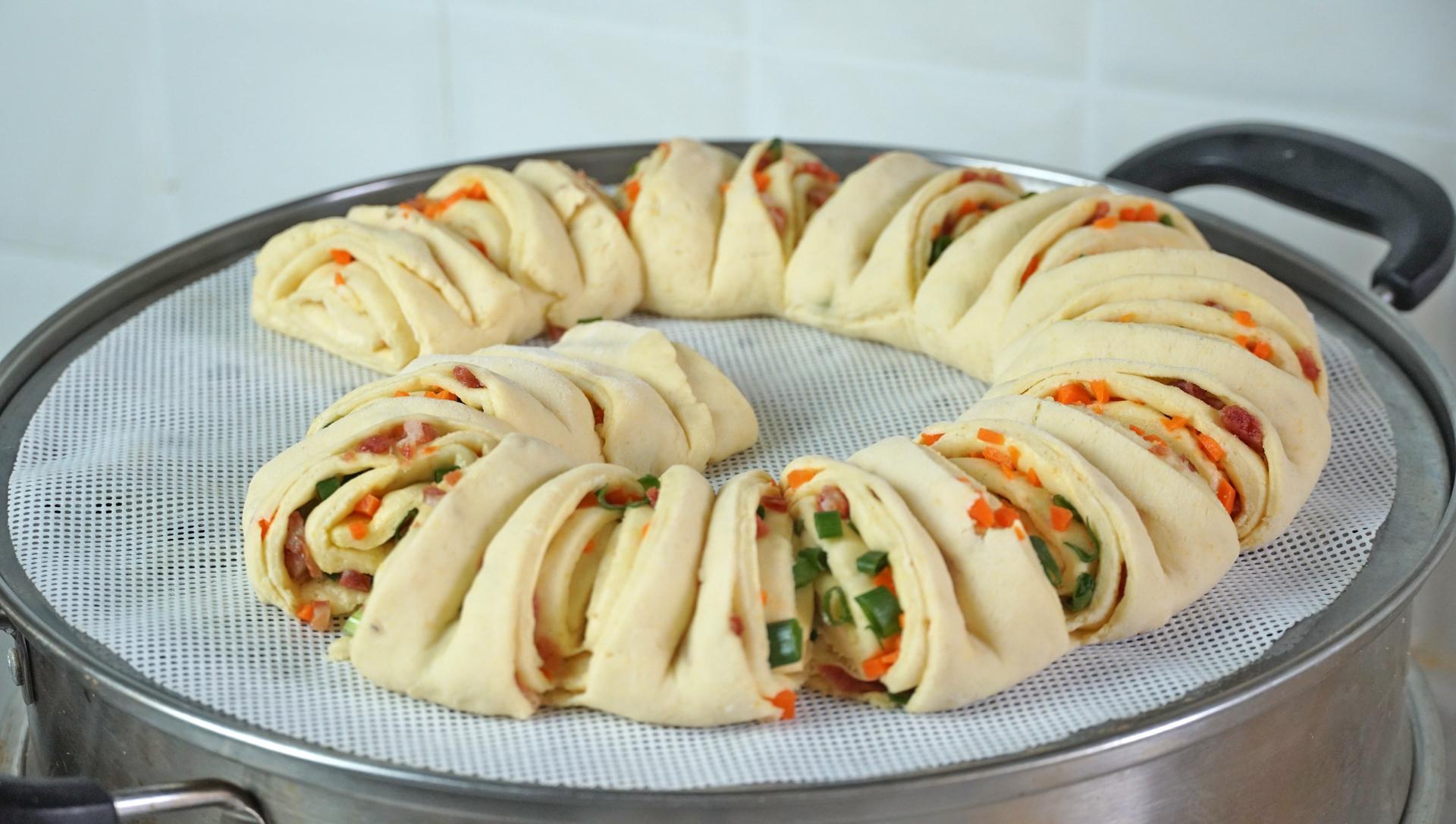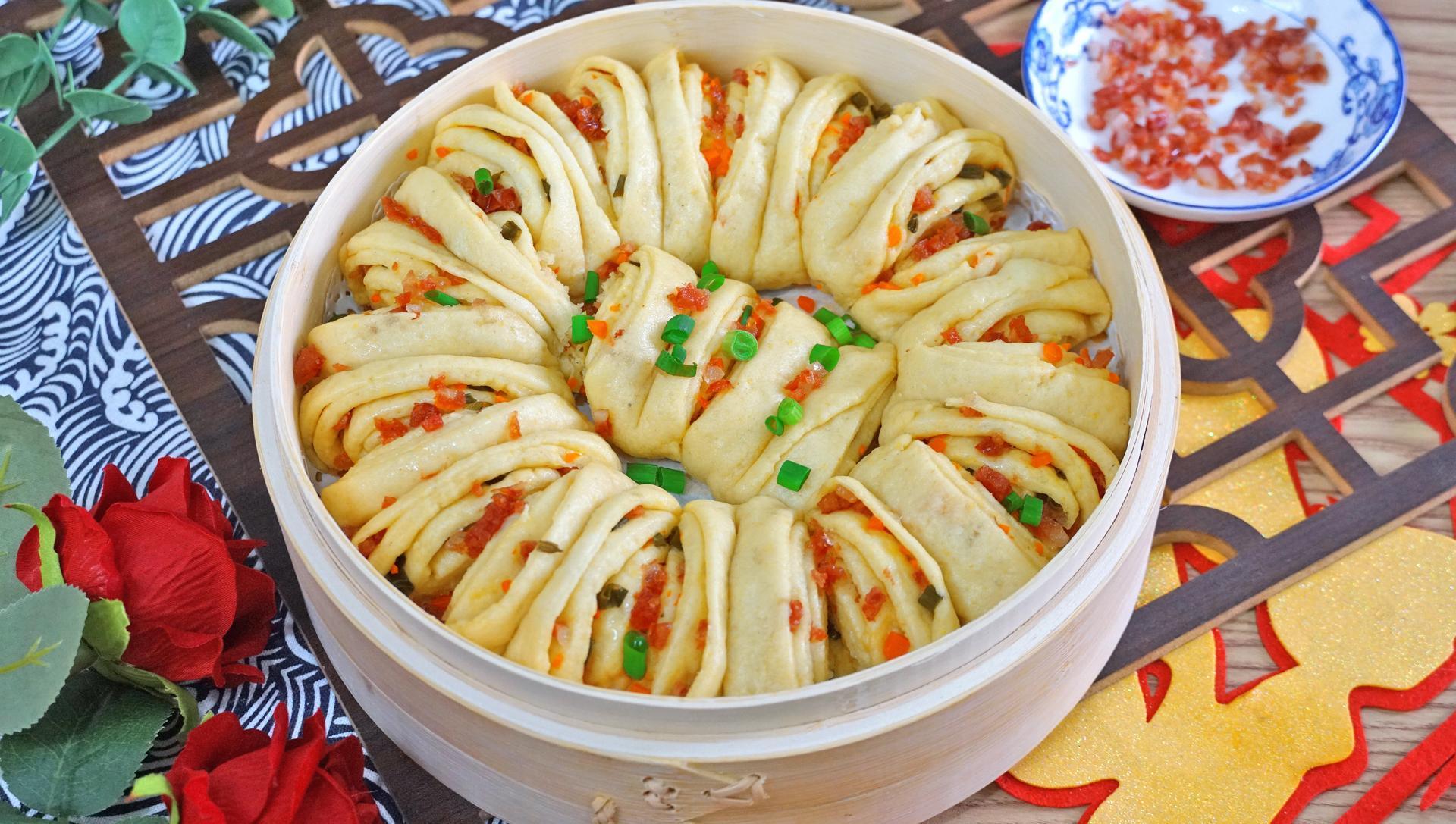 6、接着上鍋蒸,水開計時,大火蒸15分鐘,關火後再燜3分鐘避免塌陷。香噴噴的大花捲就出鍋了,柔軟又細膩,還有濃郁的蔥香。