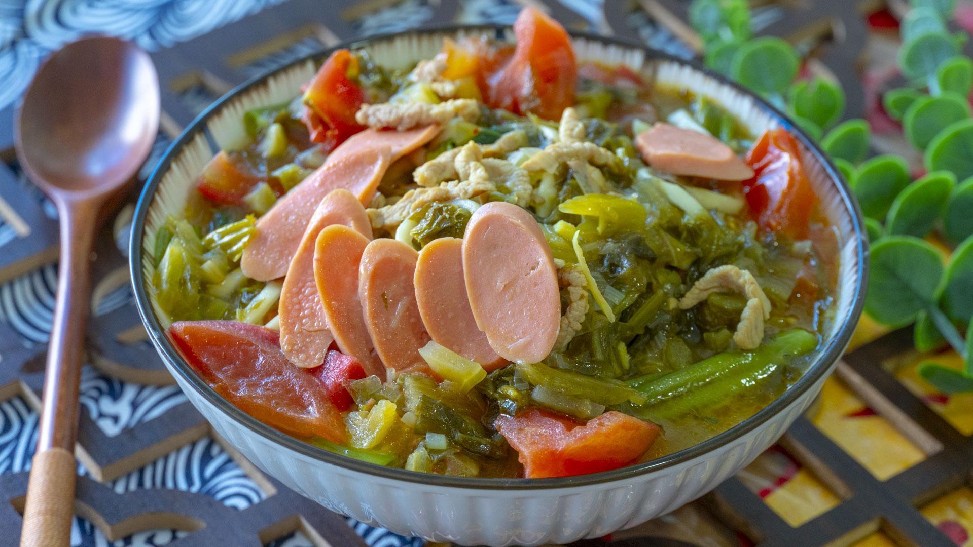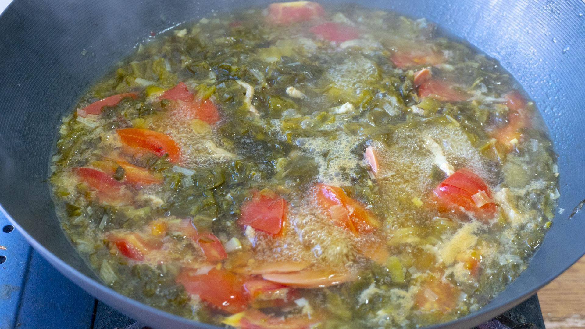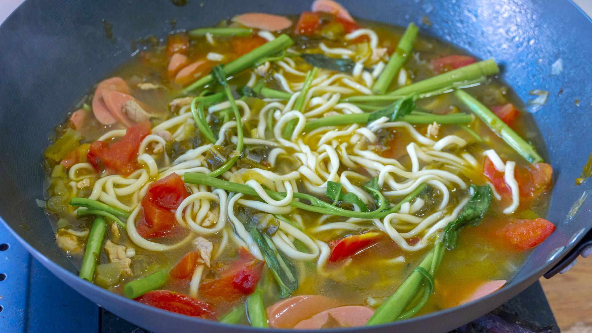 再來點青菜,好喫的酸菜肉絲麪就做好了,簡單又好喫。