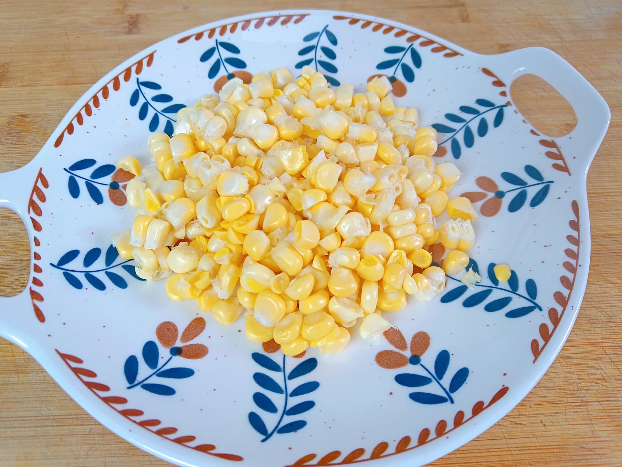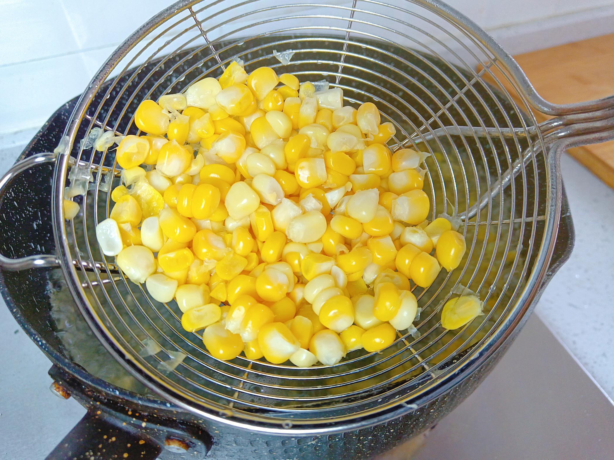 6、另起鍋燒水,水開倒入玉米粒焯水,大火煮1分鐘就夠了,煮到全部飄起來就可以撈出來備用了。