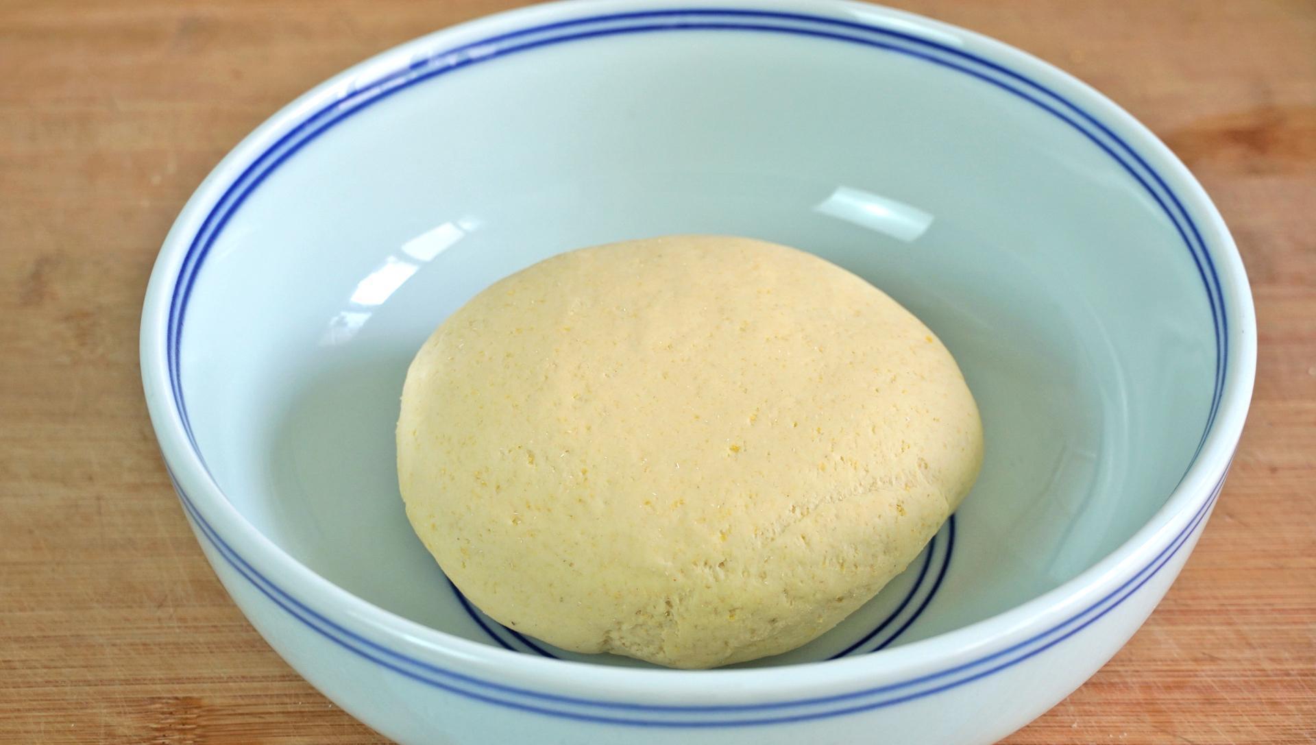 1、碗里加120克玉米麪粉,100克開水,稍微放置溫熱後再加200克小麥麪粉,3克糖、3克酵母、拌勻後再加60克溫水,攪拌成大面絮狀後下手揉麪,揉光滑後醒發至體積的2倍大。
