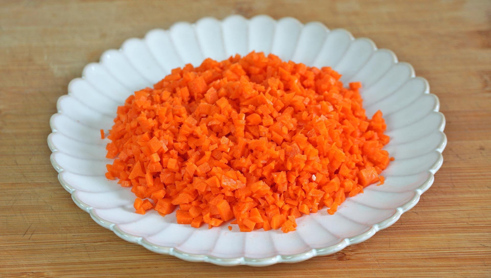 2、胡蘿蔔半根,去皮後切成小丁備用。
