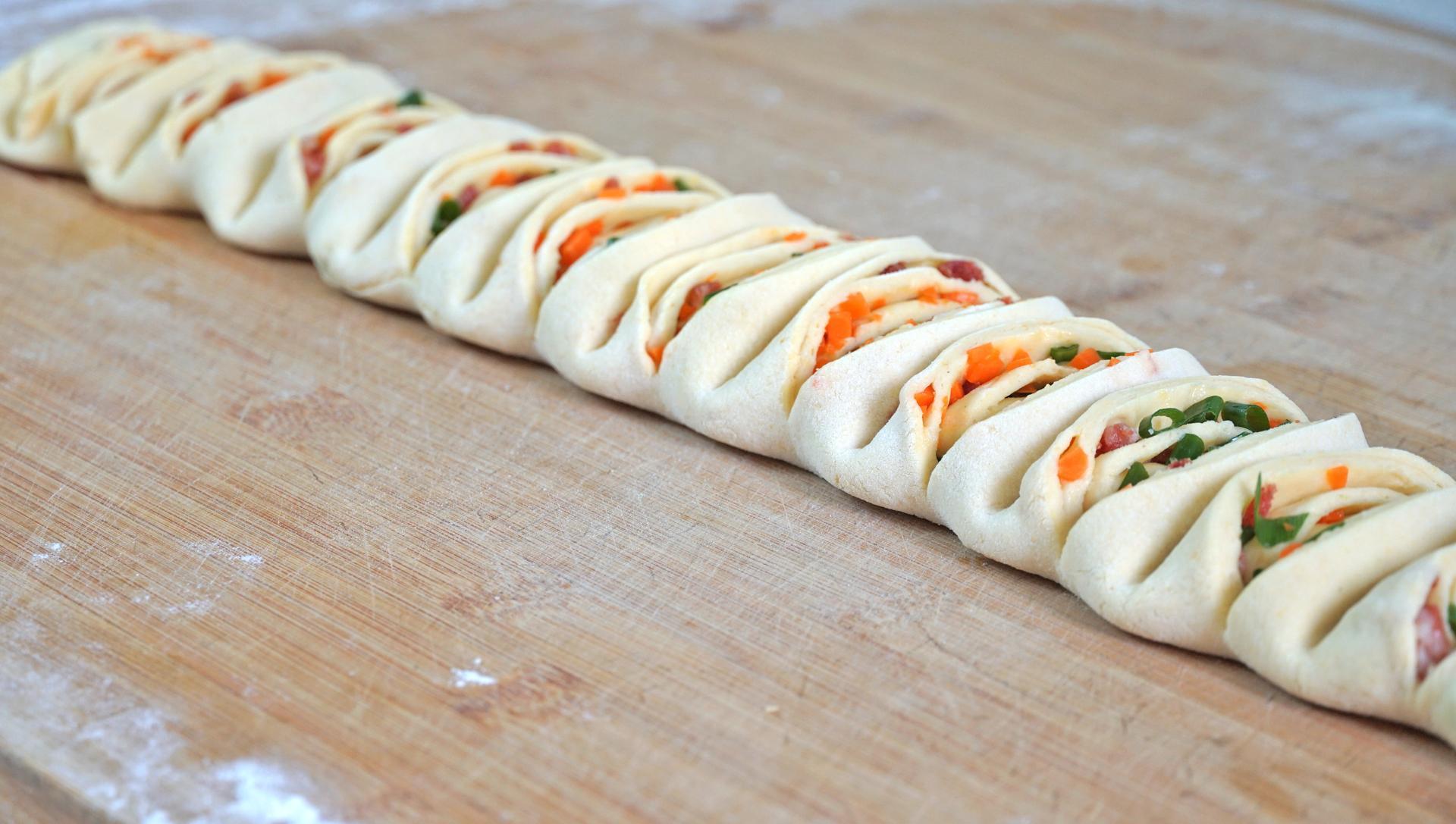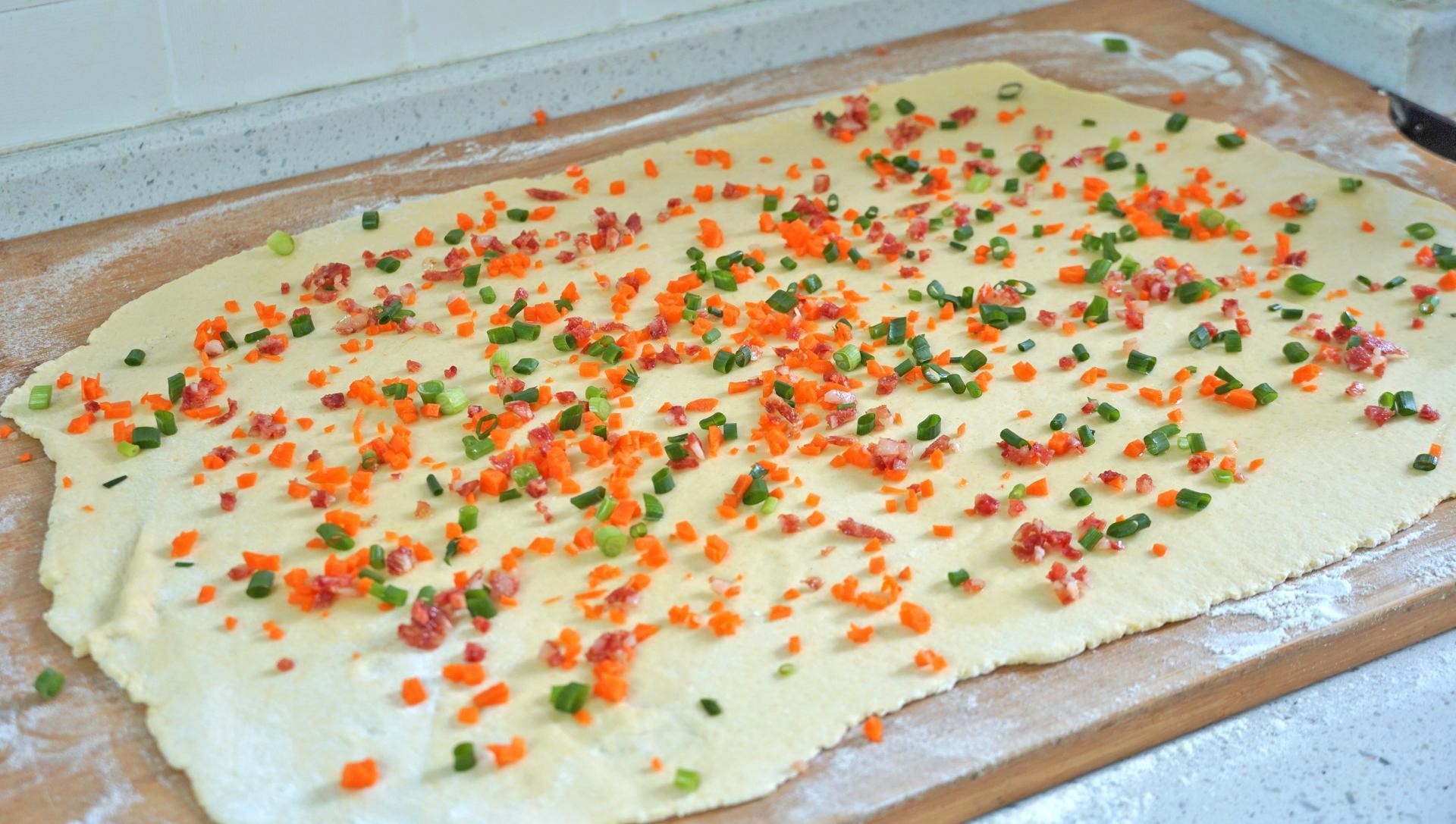 3、麪糰醒發好後體積變大,撒點乾麪粉後下手揉一揉,給它充分的排氣,這樣口感纔會細膩。接着擀開擀薄,擀成一張長方形的大面片後就可以了,先刷上薄薄的一層油,接着先鋪上一層胡蘿蔔丁,再均勻的撒上香腸丁,最後再來一把小蔥花,最後撒上少許鹽調味。