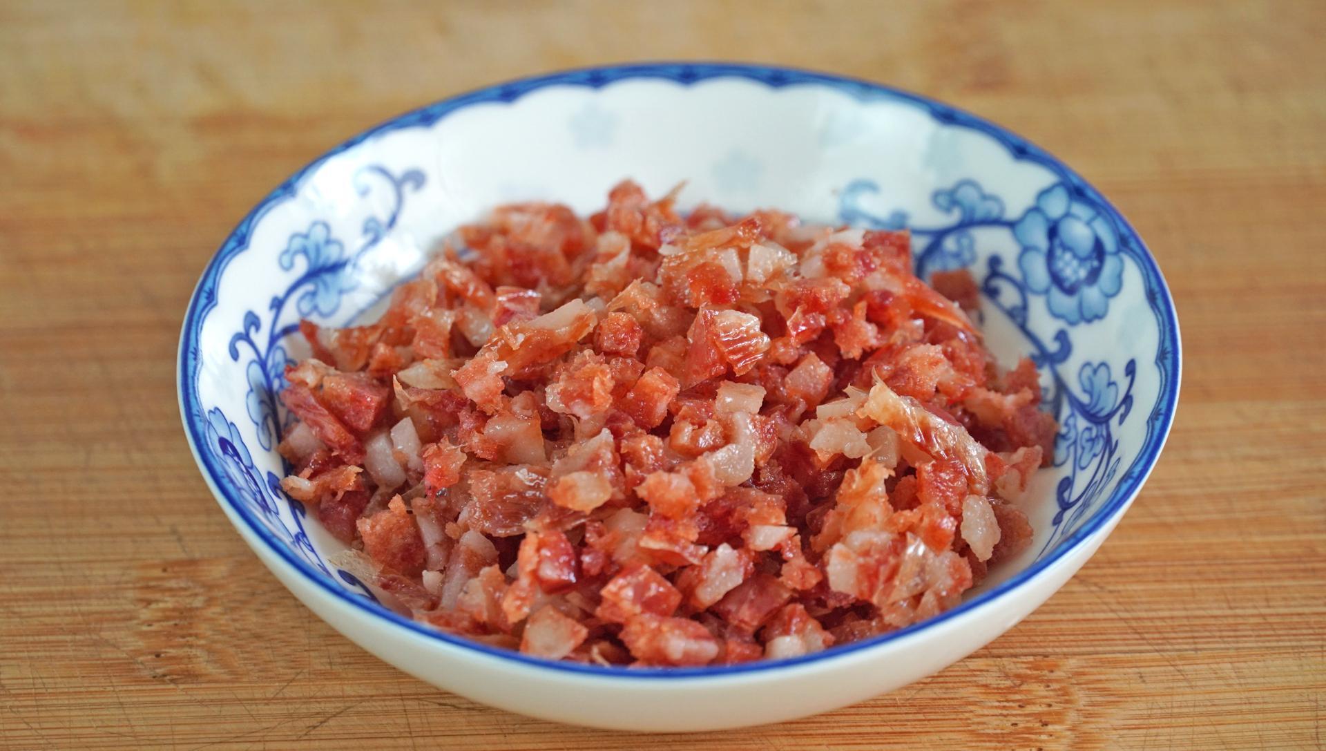 2、小蔥1把,洗淨後切蔥花,只要蔥綠部分就可以了;香腸1根,也切成小丁備用。