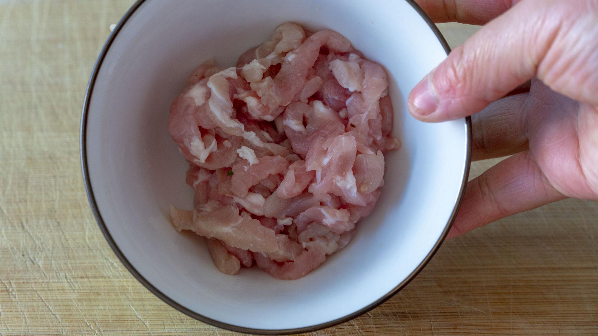 6、起鍋熱油,下蔥姜爆香,出香味後倒入肉絲翻炒。