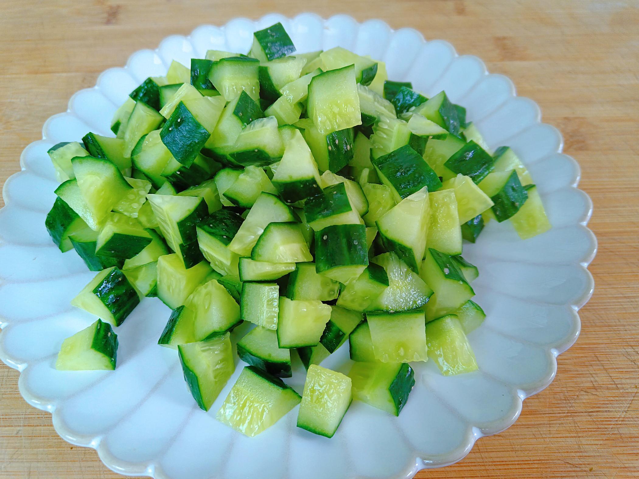 4、黃瓜1根,洗淨後去頭去尾,不用削皮,接着切成小丁。