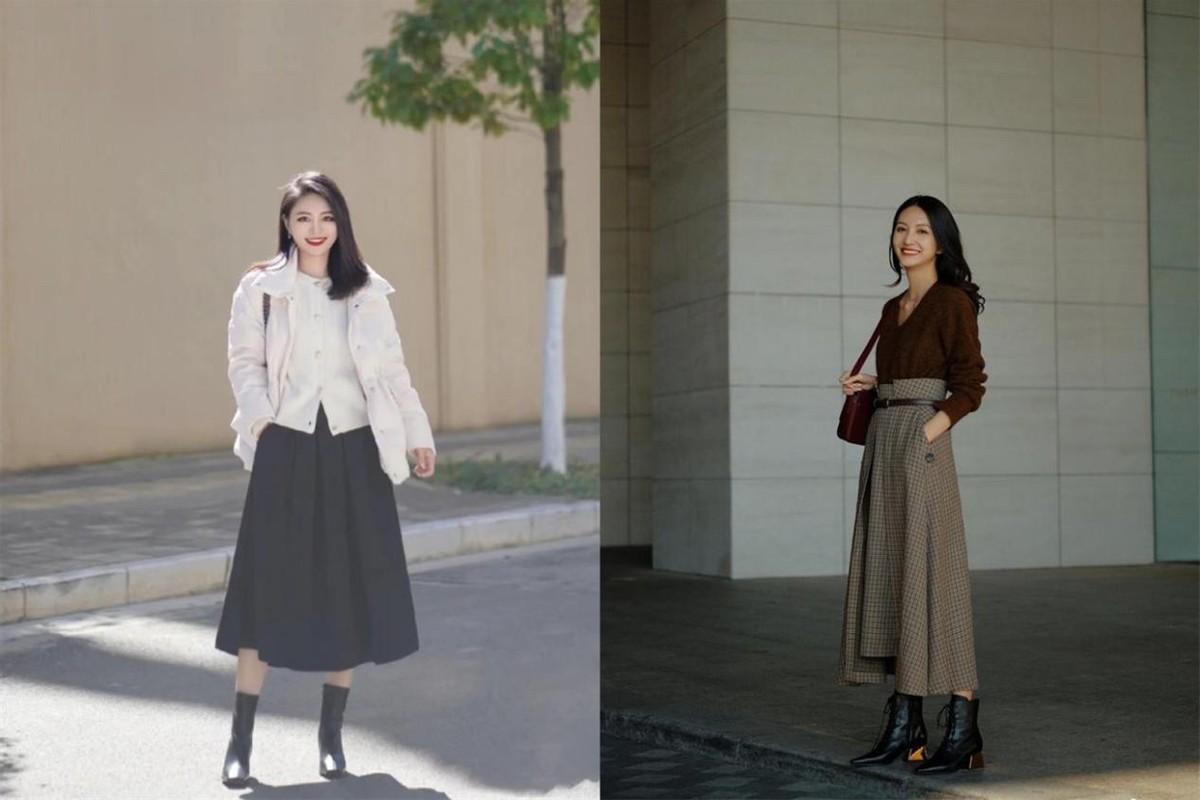 基礎款式的服裝單品,不管怎麼搭配都不容易出錯,沒有加入多餘裝飾和元素的半身傘裙,只需要搭配一雙修飾腳踝線條的粗低跟踝靴,就能夠穿出很顯瘦的效果。踝靴和傘裙之間,也要保證一定的留白麪積,不能讓造型看上去過於保守。