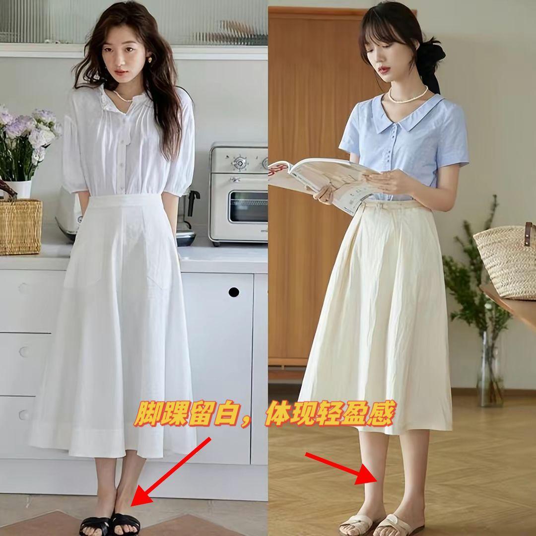 春夏季節的穿搭,應當考慮到輕盈感的體現,所以我們挑選的服裝顏色不能太沉悶,款式不可太繁瑣,尤其是鞋子的挑選,一定要避開笨重的情況。傘裙和鞋子之間,要體現出留白的效果,剛好過膝蓋的半身傘裙,可以搭配上半拖鞋、淺口鞋,露出腳踝位置更令人心動。