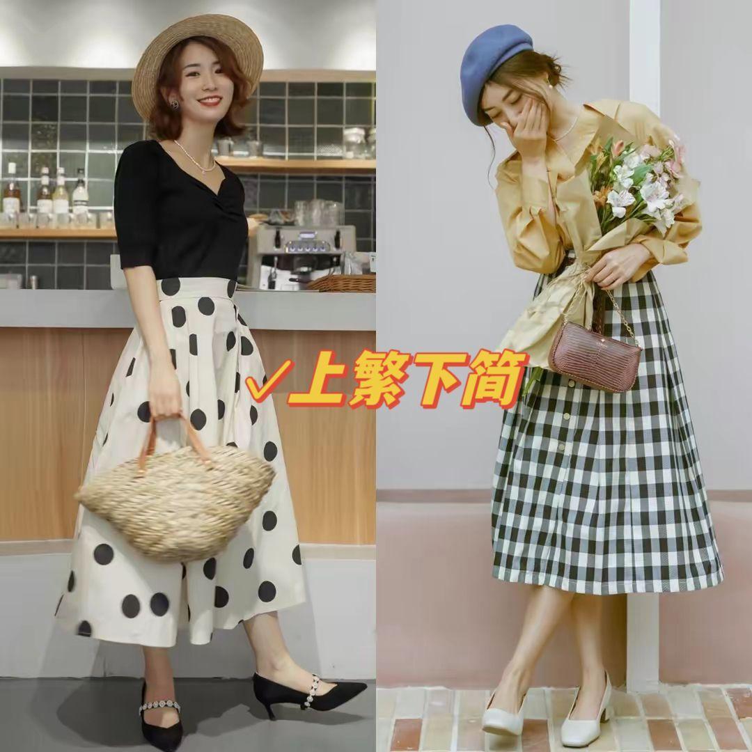 半身裙和上衣進行分離,能夠很好的解鎖無數種的可能性。像這種上繁下簡的穿搭方式,在視覺上就特別時髦,而且還能分割身材比例。裙襬當中加入經典的波點、格紋元素,在搭配上一件基礎款的上衣,便可以爲穿搭賦予更多的價值,上衣領口較低的前提下,我們可以佩戴一款精緻的珍珠項鍊,從而修飾鎖骨線條。