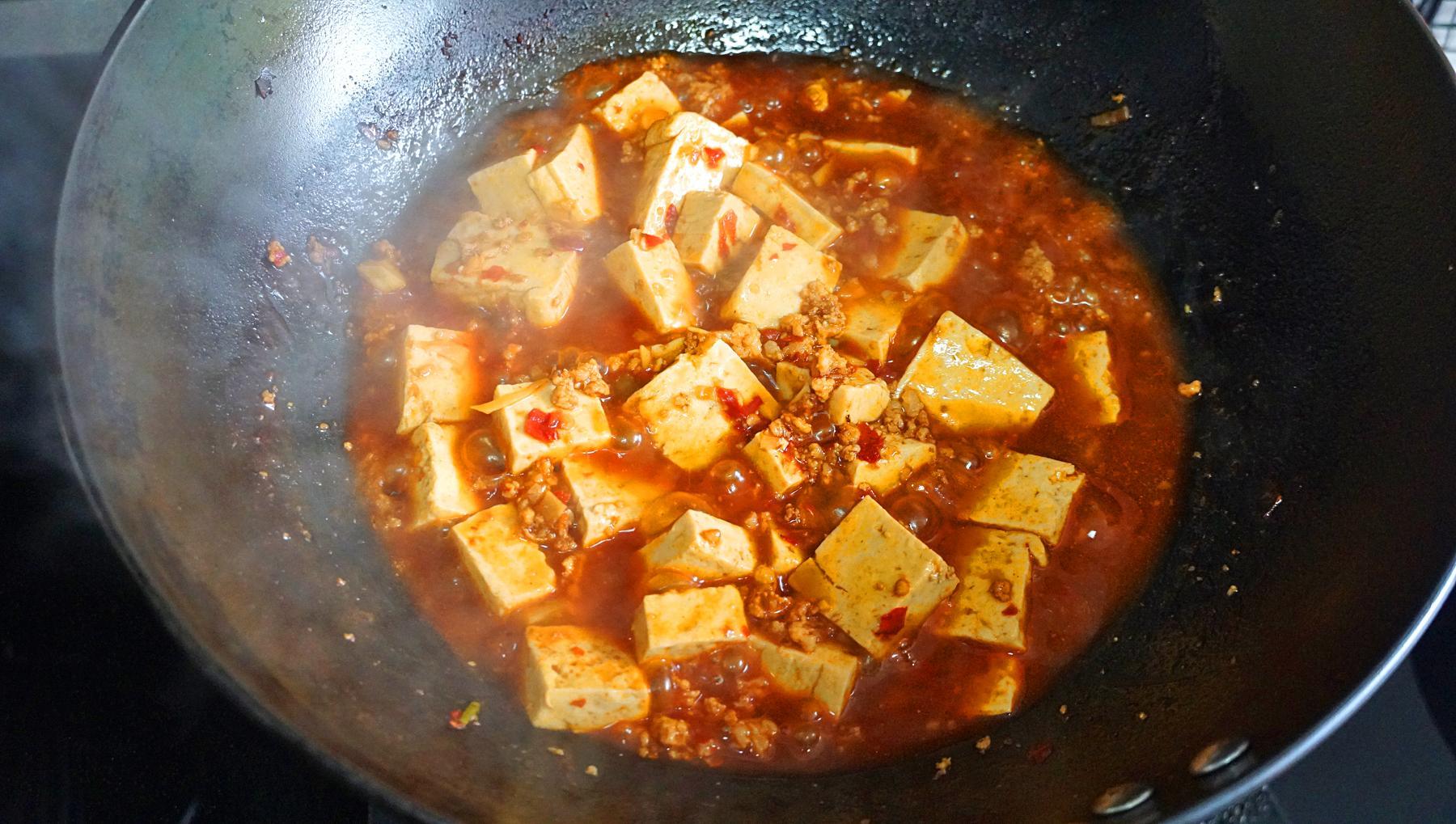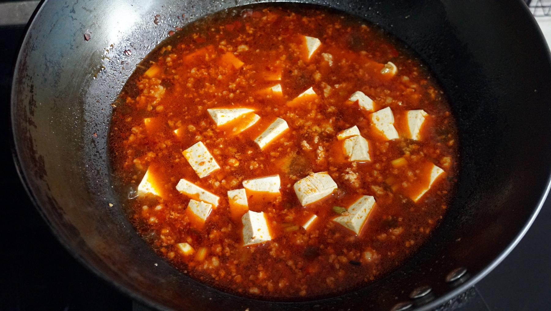 3、最後再來一碗水,先給它煮開,然後把豆腐倒進來,繼續煮個5分鐘,讓豆腐入一下味,出鍋前再加把蔥花;