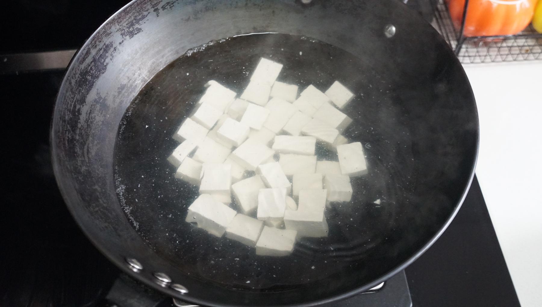 1、這個時間來做豆腐,先把它切小塊,再放到鍋裏面用水煮一下,加點鹽,煮個3分鐘就撈出來;