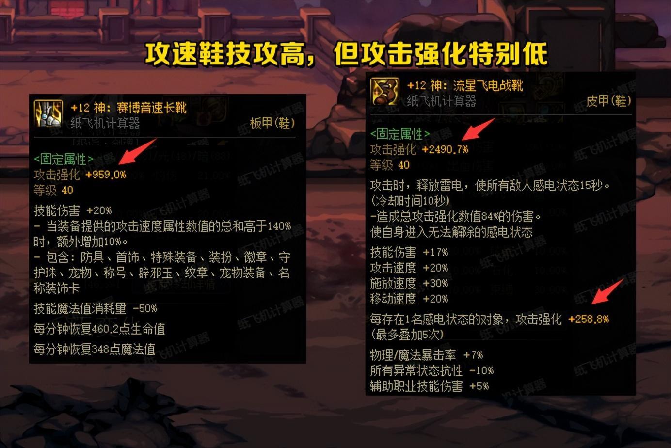 以“神lv40級”爲例,“攻速鞋”擁有「20技攻+959%攻擊強化」,而“飛電鞋”擁有「17技攻+2490%攻擊強化+258%攻擊強化」!