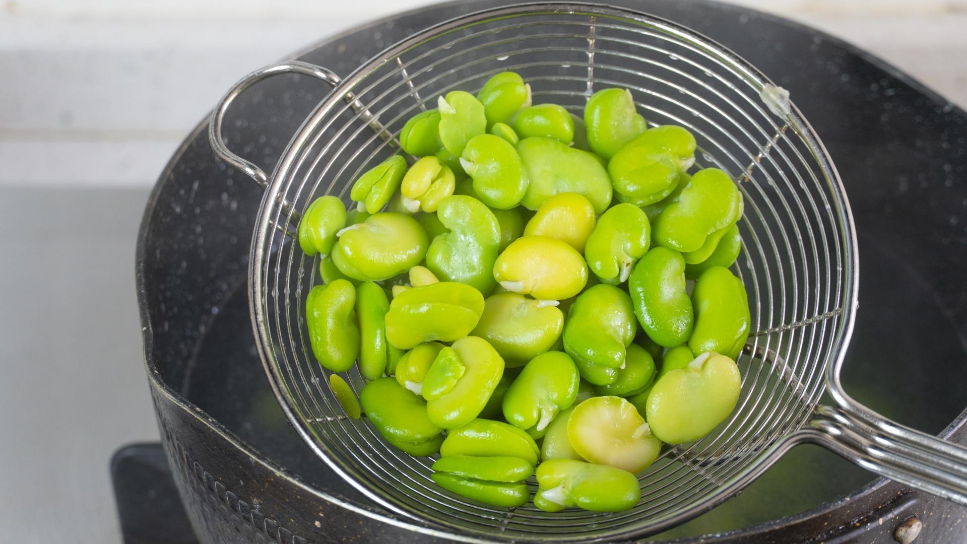 2、水開加一勺鹽和一勺食用油,倒入蠶豆焯水,大火煮2分鐘。