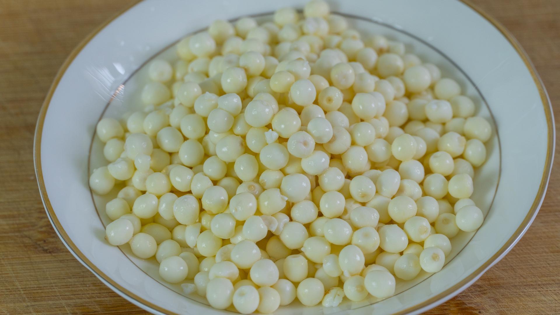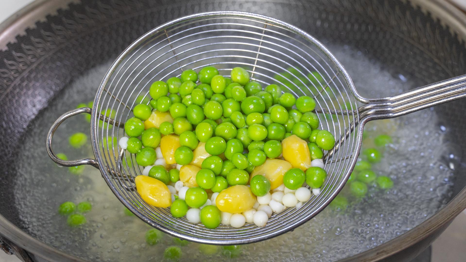 3、起鍋燒水,水開加一勺油和一勺鹽,把雞頭米、青豆、白果都倒進來焯一下水。