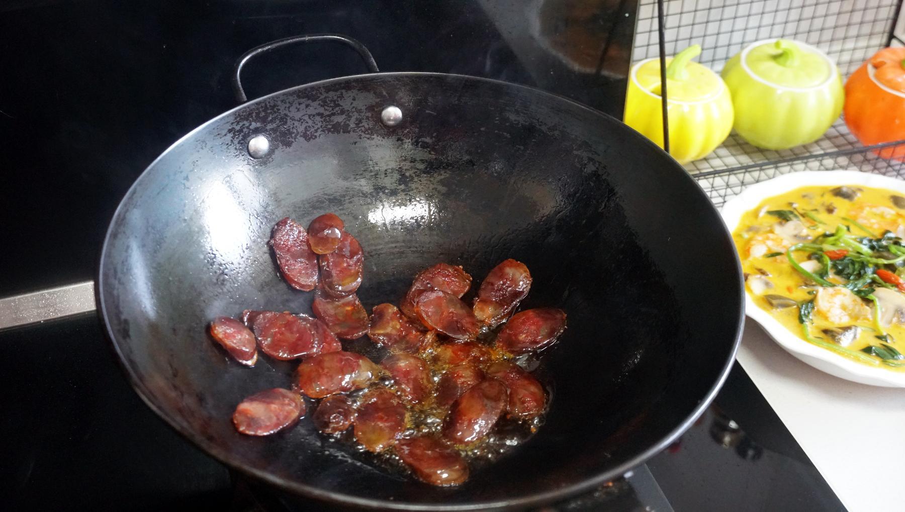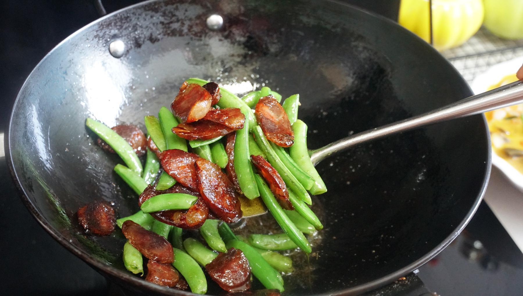 2、鍋裏油熱了就先炒香腸,然後甜豆倒進來大火翻炒個幾下。