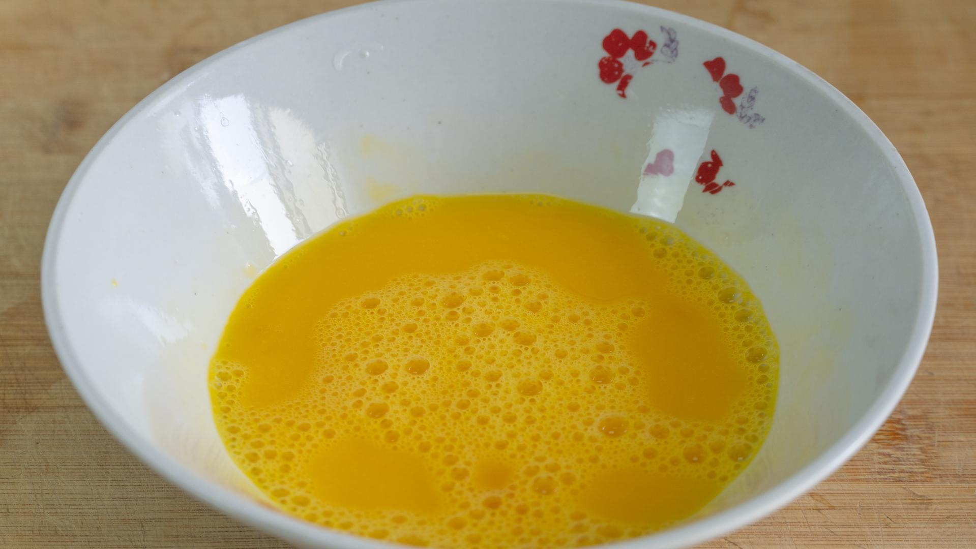 3、碗裏打入3個雞蛋,加一勺鹽和兩滴白醋後攪散。