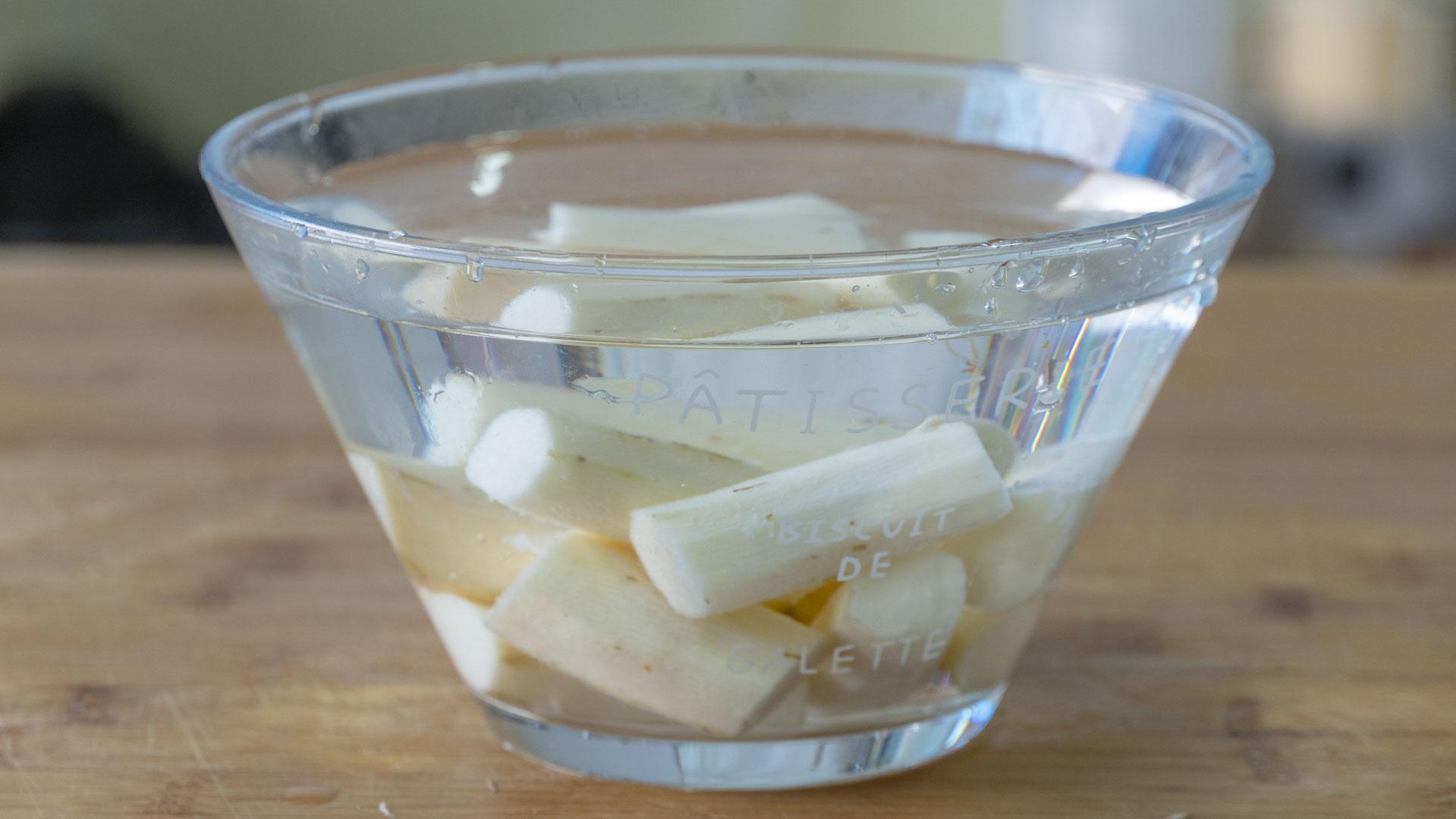 3、再準備一根兒山藥,削皮後切大塊兒,然後放入清水中泡着。
