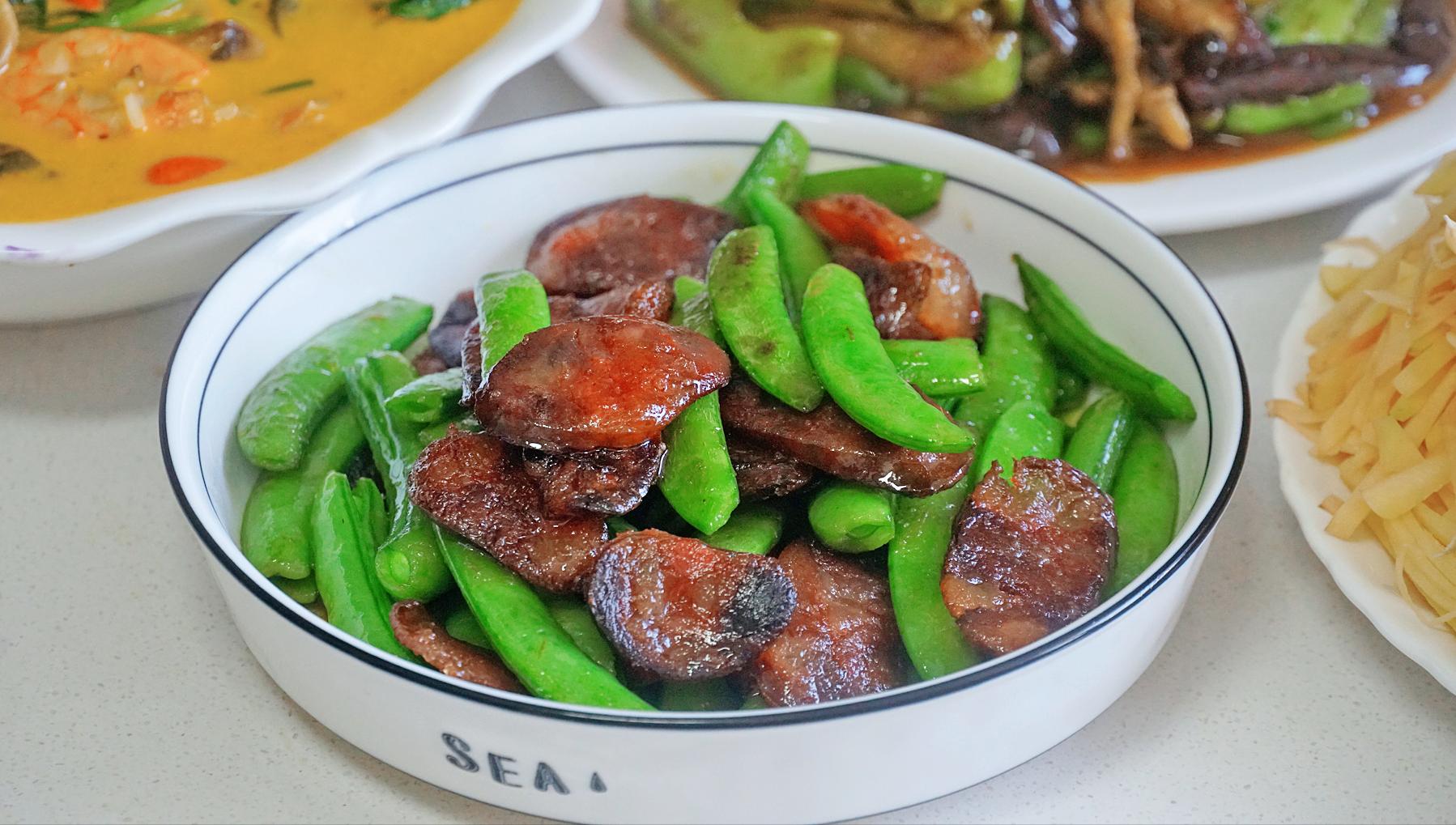 1、甜豆我焯了一下水再炒的,香腸也都是熟的;