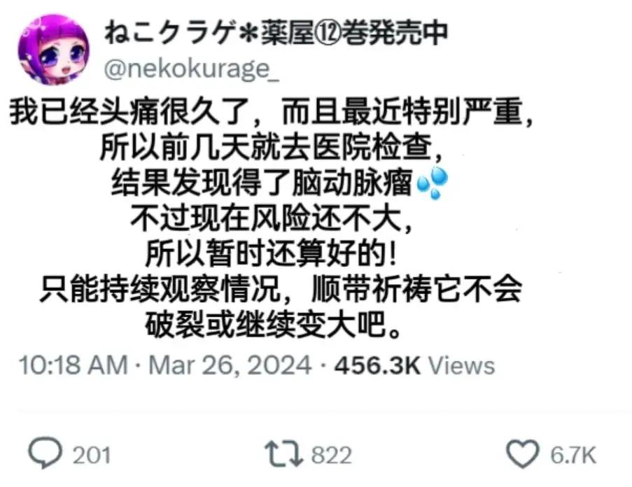 負責《藥屋少女的呢喃》漫畫作畫的貓海月老師,最近發推表示自己確診了腦動脈瘤,所幸目前尚無太大風險,還需要後期持續觀察。