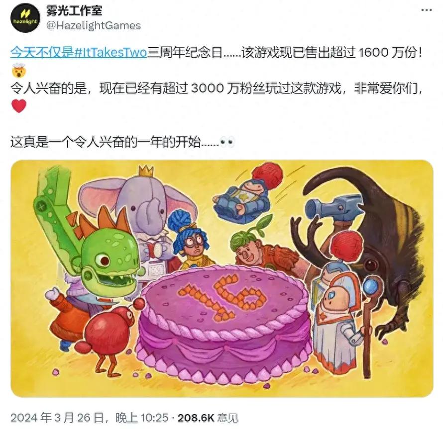 3月26日,《雙人成行》迎來發售三週年紀念日,同時開發商Hazelight也宣佈遊戲的銷量突破1600萬,各平臺總遊玩人數則突破3000萬。