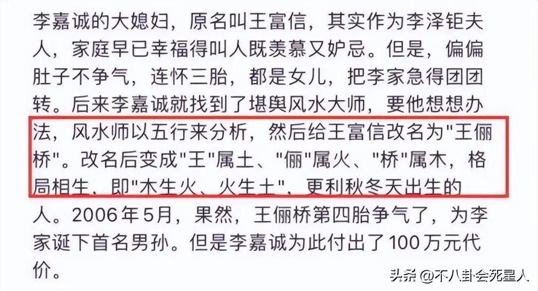 傳聞當年王儷橋連生3個女兒,之後花了百萬找風水大師改名,才生下長子李長禧,她的原名是王富信。
