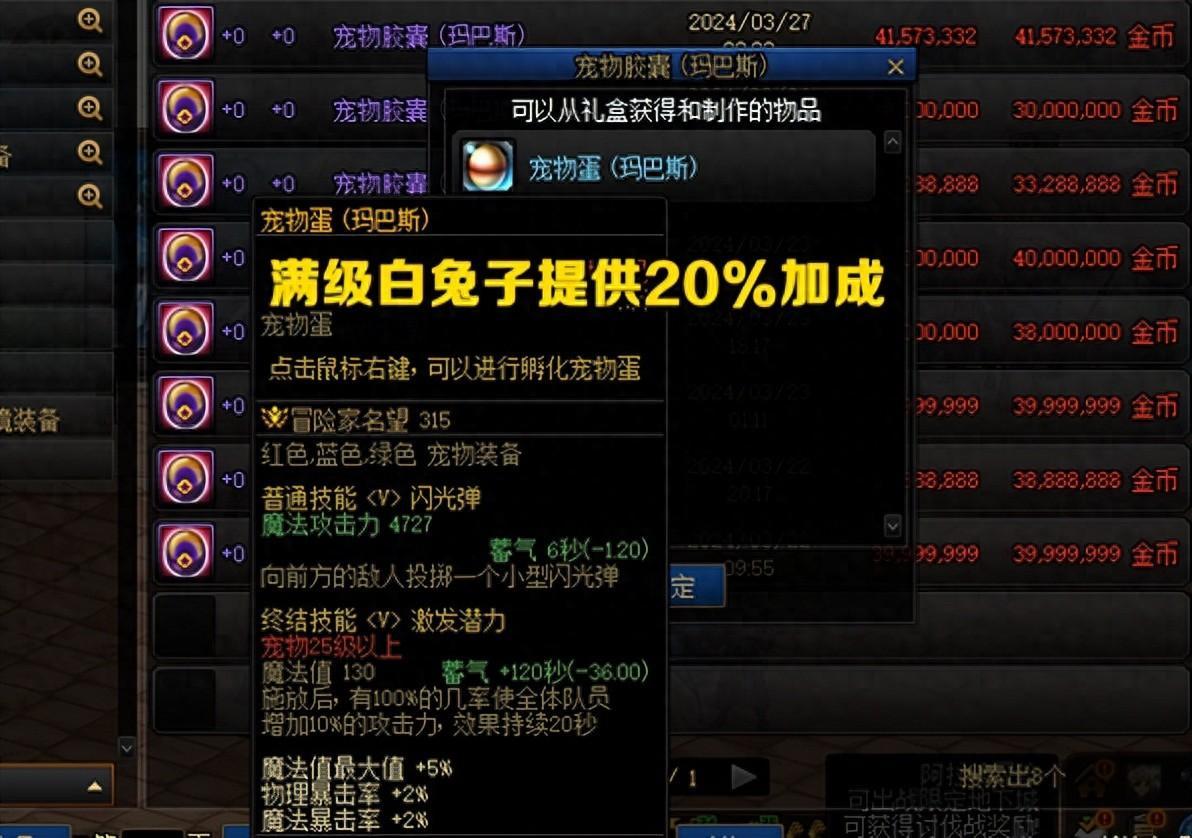 【1】拍賣行入手一隻“白兔子寵物”,並且升到滿級,可提供20%傷害提升!