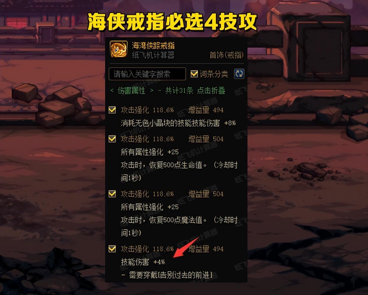 【3】“魔女戒指”替換成“海俠戒指”,並且一定要選擇其中的4技攻詞條,這個詞條必須搭配石化鞋才能觸發。
